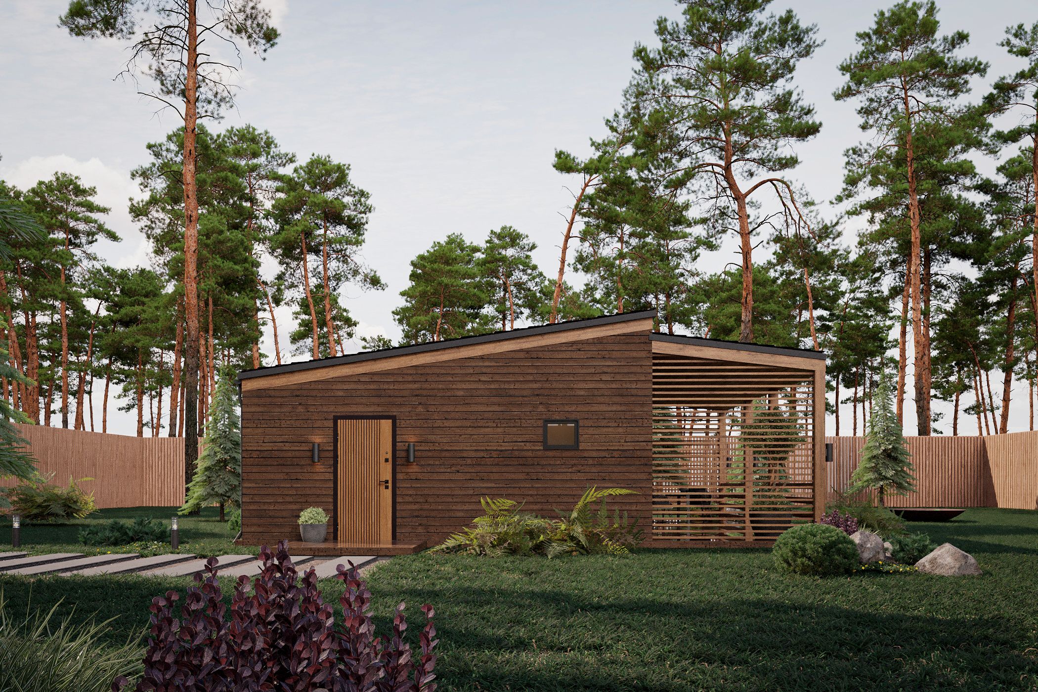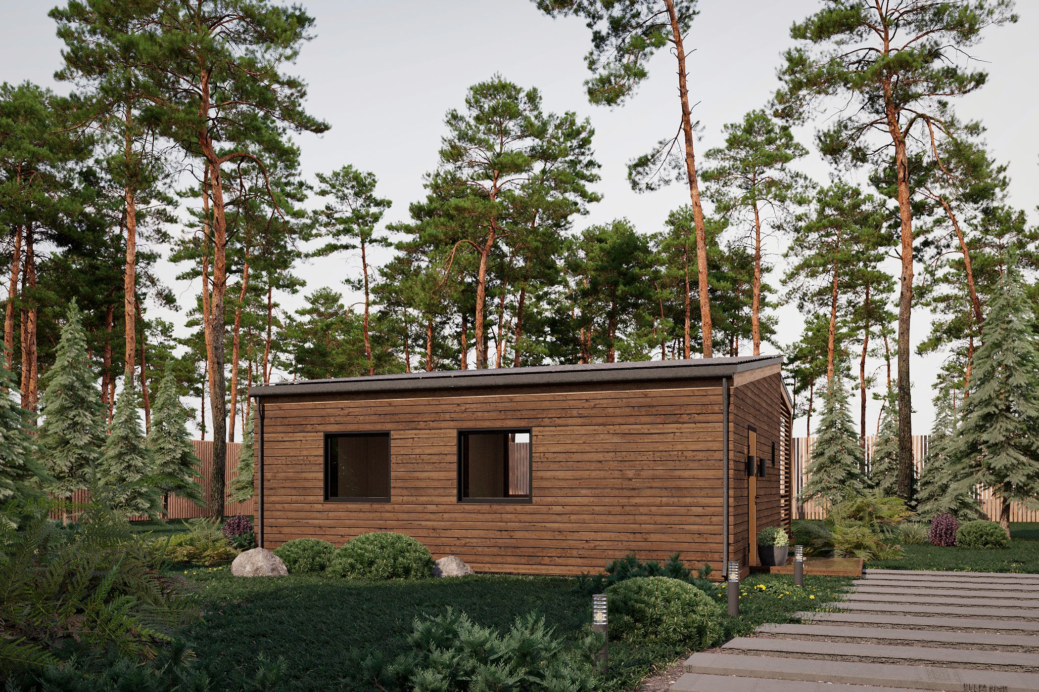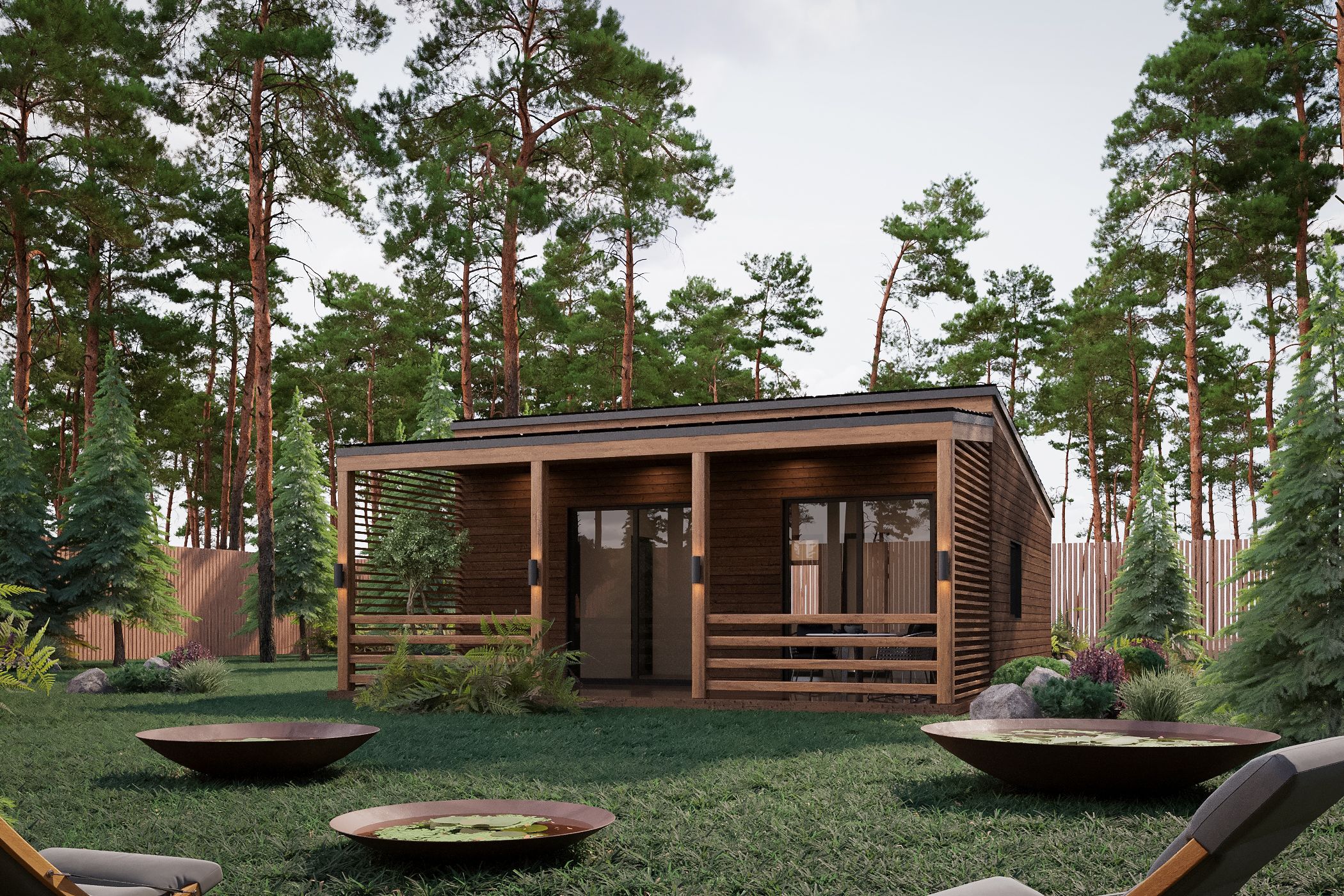 Готовый проект одноэтажного дома общей площадью 44,96 м² для строительства по каркасной технологии. По плану в доме санузел (3,12 м²), просторная кухня-гостиная (20,95 м²), две спальни (8,25 м², 7,70 м²), терраса (20,45 м²).