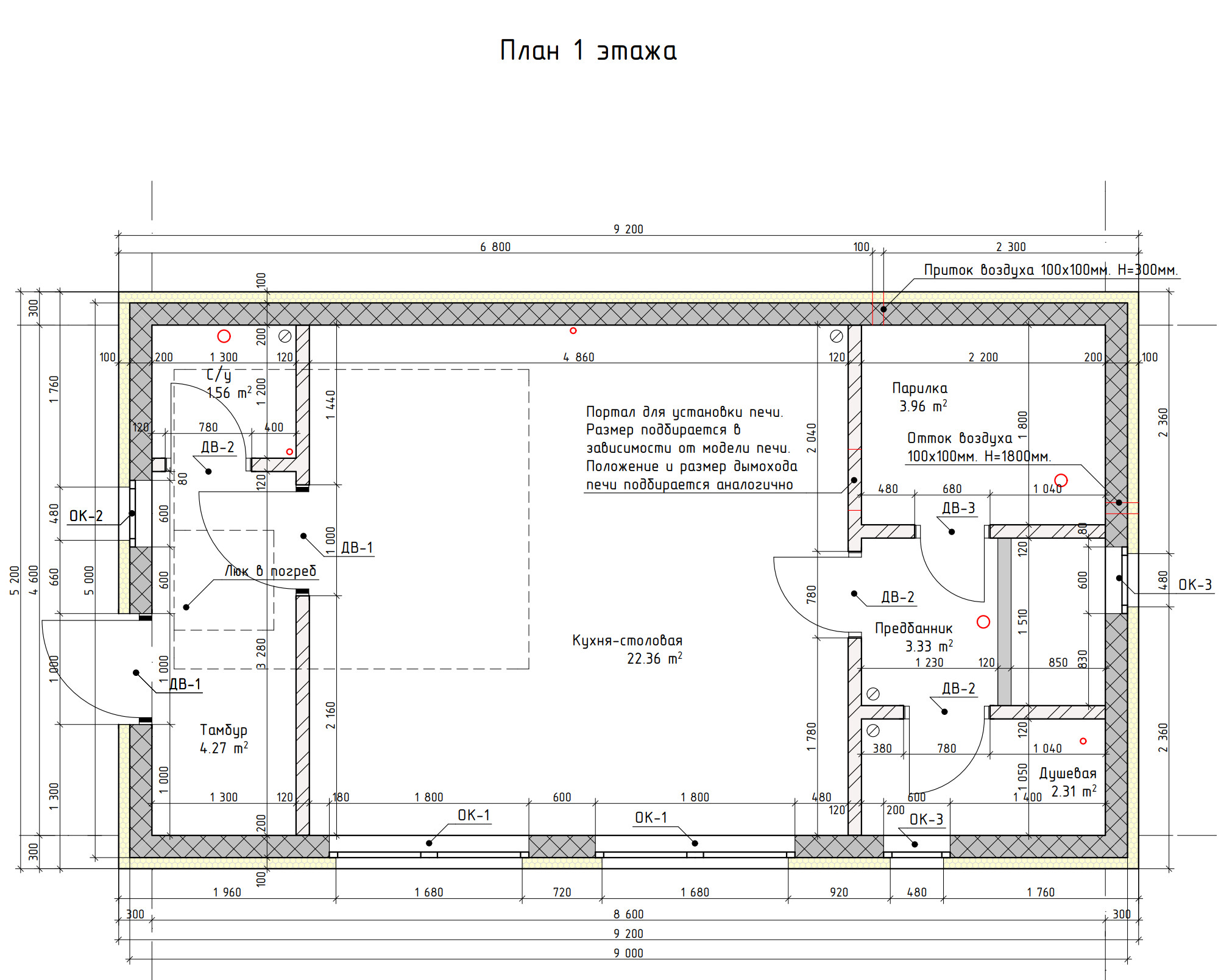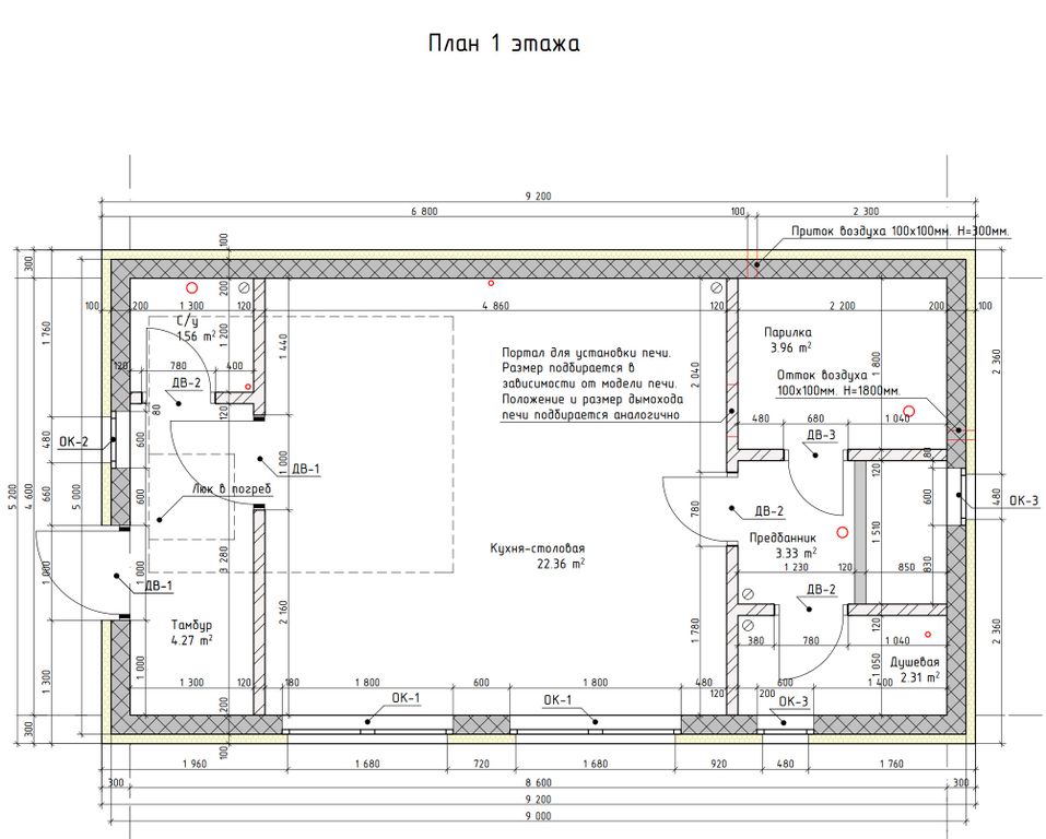 Готовый проект одноэтажной бани общей площадью 37,79 м². Стены дома могут быть выполнены из газосиликатных блоков или силикатного кирпича. По плану в доме тамбур (4,27 м²), санузел (1,56 м²), просторная кухня-столовая (22,36 м²), предбанник (3,33 м²), парилка (3,96 м²) и душевая (2,31 м²).
