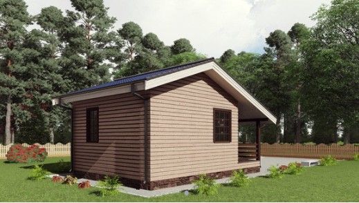 Готовый проект одноэтажной бани общей площадью 29 м² для строительства по каркасной технологии. По плану в доме хозяйственное помещение, санузел, душевая, парная, комната отдыха и терраса.