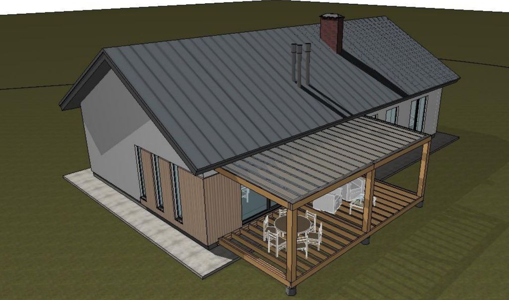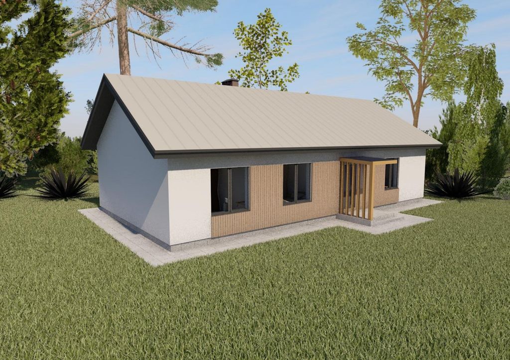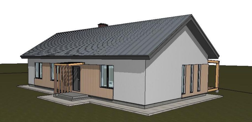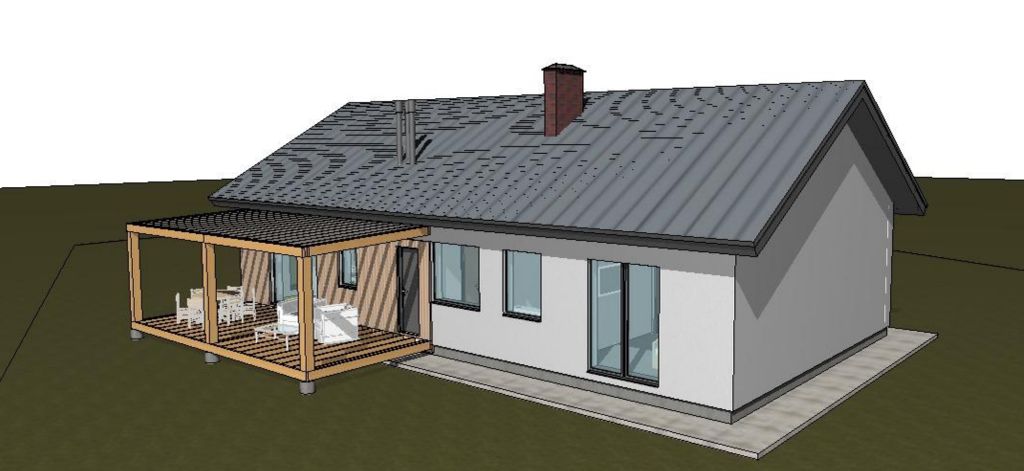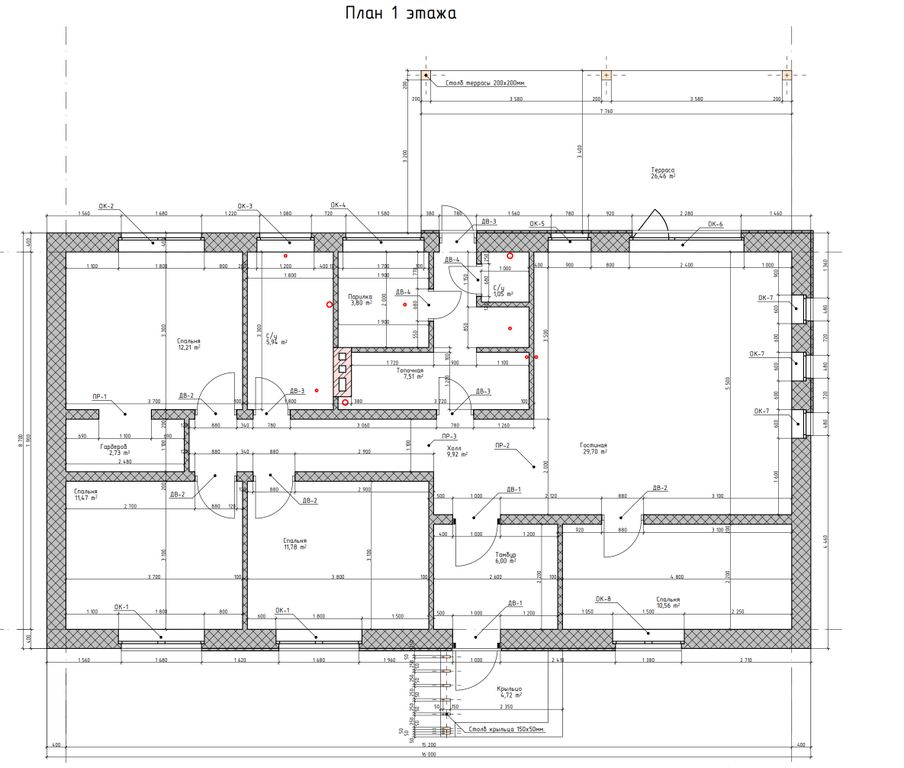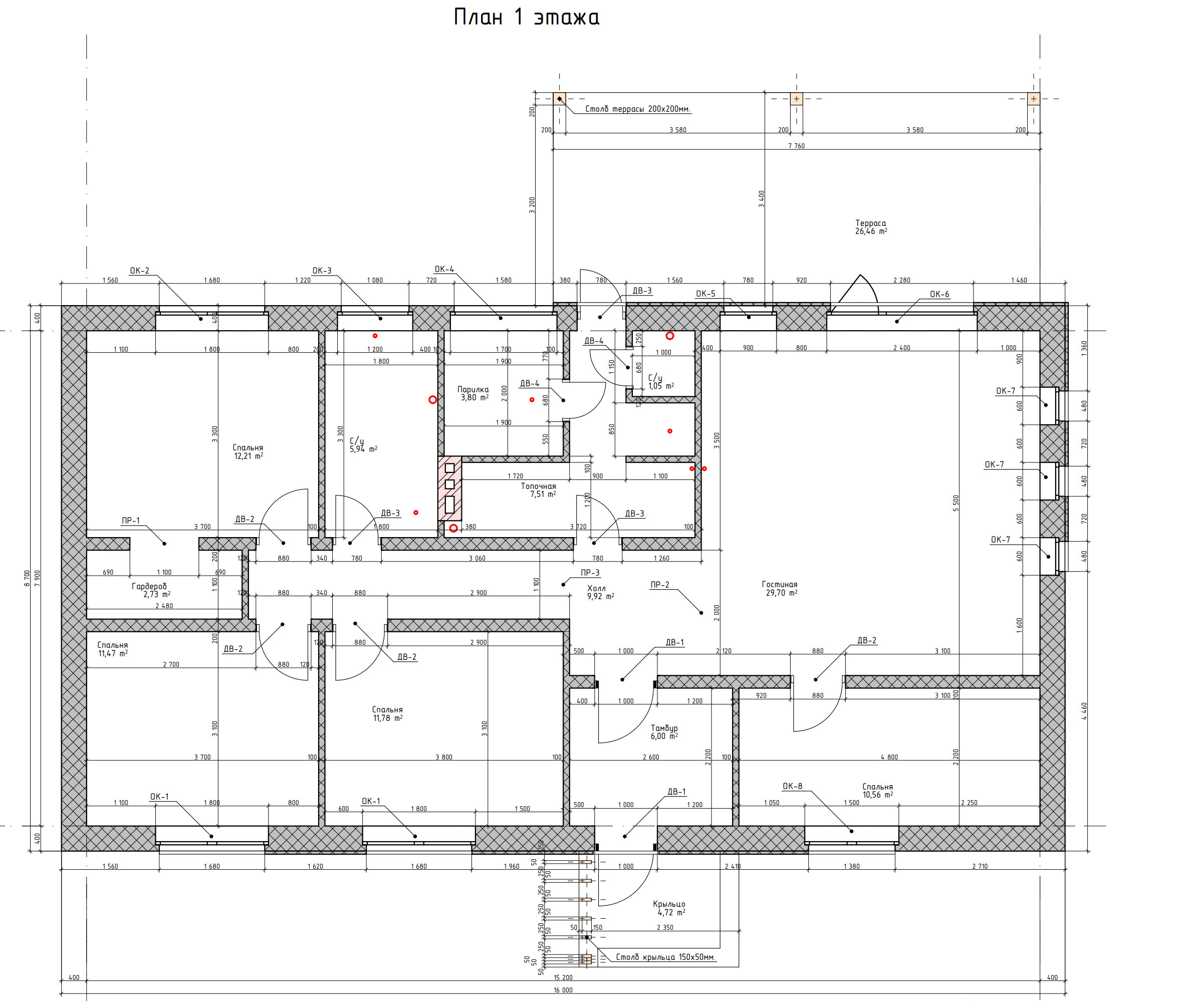 Готовый проект одноэтажного дома общей площадью 112,67 м². Стены дома могут быть выполнены из газосиликатных блоков или силикатного кирпича. По плану в доме тамбур (6,00 м²), холл (9,92 м²), топочная (7,51 м²), парилка (3,80 м²), два санузла (1,05 м², 5,94 м²), гардероб (2,73 м²), четыре спальни (10,56 м², 11,47 м², 11,78 м², 12,21 м²), просторная кухня-гостиная (29,70 м²) и терраса (26,46 м²).