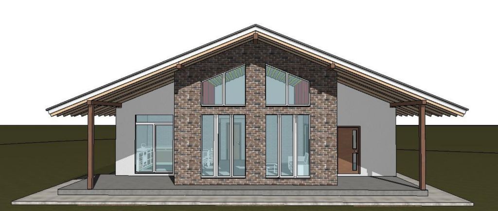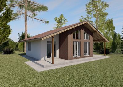 Готовый проект одноэтажного дома общей площадью 94 м². Стены дома могут быть выполнены из газосиликатных блоков или силикатного кирпича. По плану в доме тамбур (9.96 м²), холл (3.47 м²), котельная (5.38 м²), санузел (6.05 м²), кухня (9.95 м²), гостиная (26.03 м²), две спальни (14.25 м², 14.25 м²) и терраса (26.48 м²).