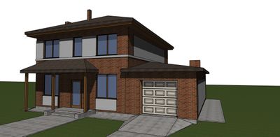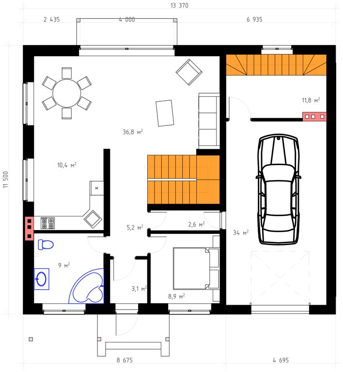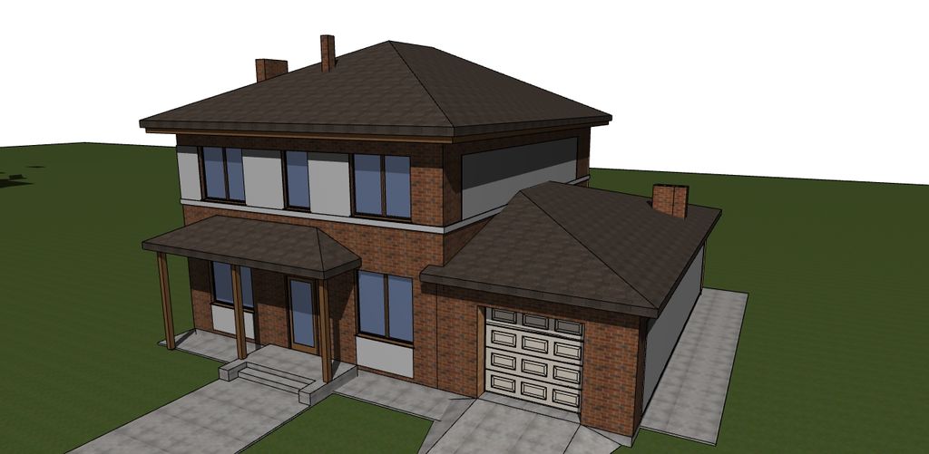 Проект дома общей площадью 265 м² с цокольным этажом. Стены дома могут быть выполнены из газоблоков или силикатного кирпича. По плану на первом этаже дома 1 спальня (8,9 м²), просторная гостиная (36,8 м²), холл (5,2 м²), кухня-столовая (10,4 м²), тамбур (3,1 м²), санузел (9 м²), гараж (34 м²) и подсобные помещения. На втором этаже расположены четыре спальных комнаты (12 м², 13,7 м², 18,7 м² и 19 м²), холл (5,8 м²) и санузел (3,9 м²).