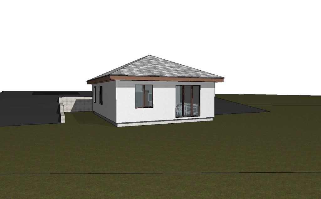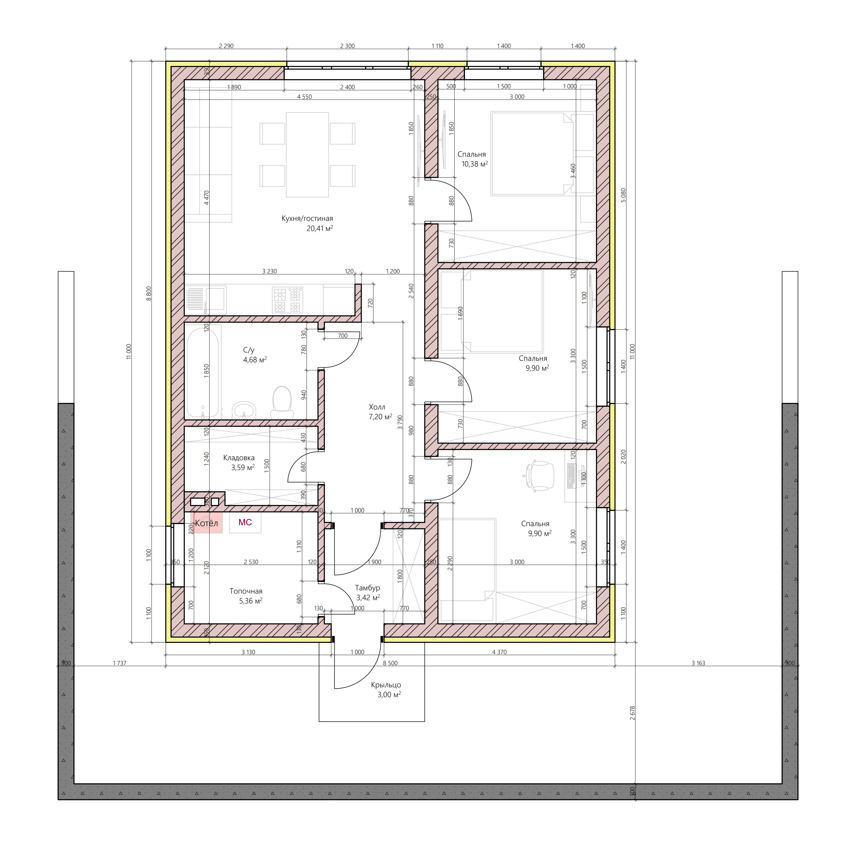 Готовый проект одноэтажного дома общей площадью 77.84 м² с тремя спальными комнатами и просторной гостиной. Стены дома могут быть выполнены из газосиликатных блоков или силикатного кирпича. По плану в доме три спальни (10.38 м², 9.90 м² и 9.90 м²), кухня/гостиная (20.41 м²), санузел (4.68 м²), кладовка (3.59 м²), тамбур (3.42 м²), холл (7.20 м²) топочная (5.36 м²), крыльцо (3.00 м²).