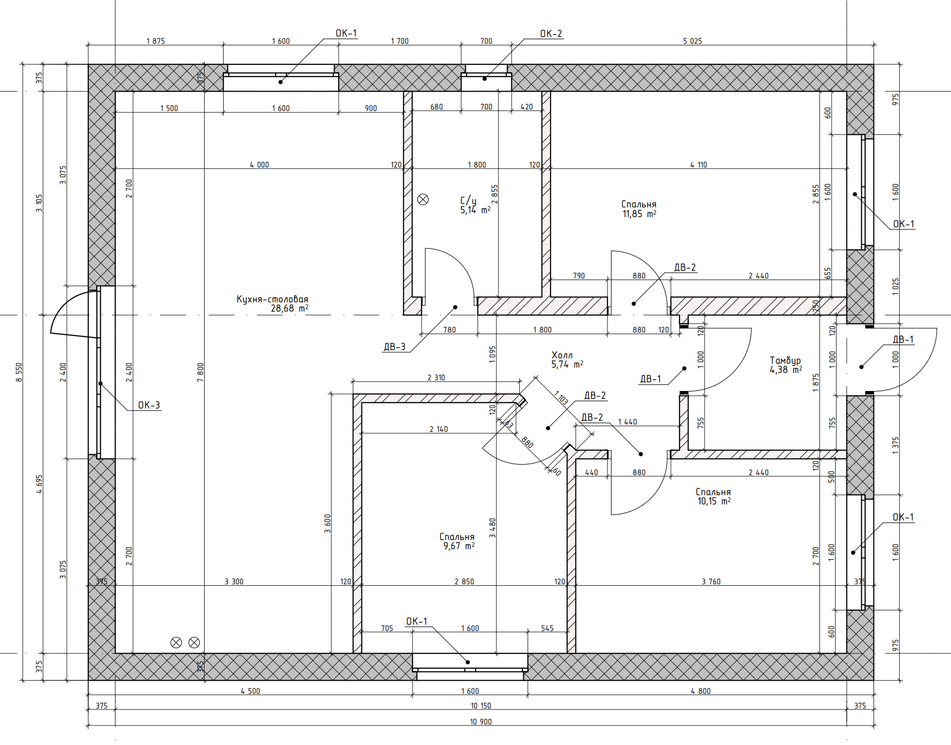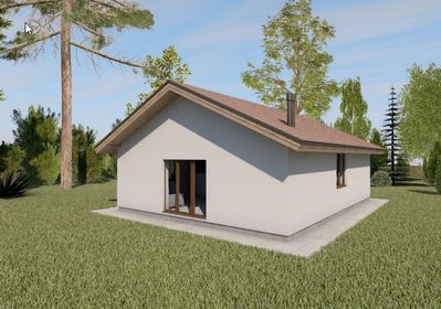 Готовый проект одноэтажного дома общей площадью 75,62 м². Стены дома могут быть выполнены из газосиликатных блоков или силикатного кирпича. По плану в доме три спальни (9,67 м², 10,15 м² и 11,85 м²), просторная объединенная кухня-столовая (28,68 м²), холл (5,74 м²), тамбур (4,38 м²) и санузел (5,14 м²).