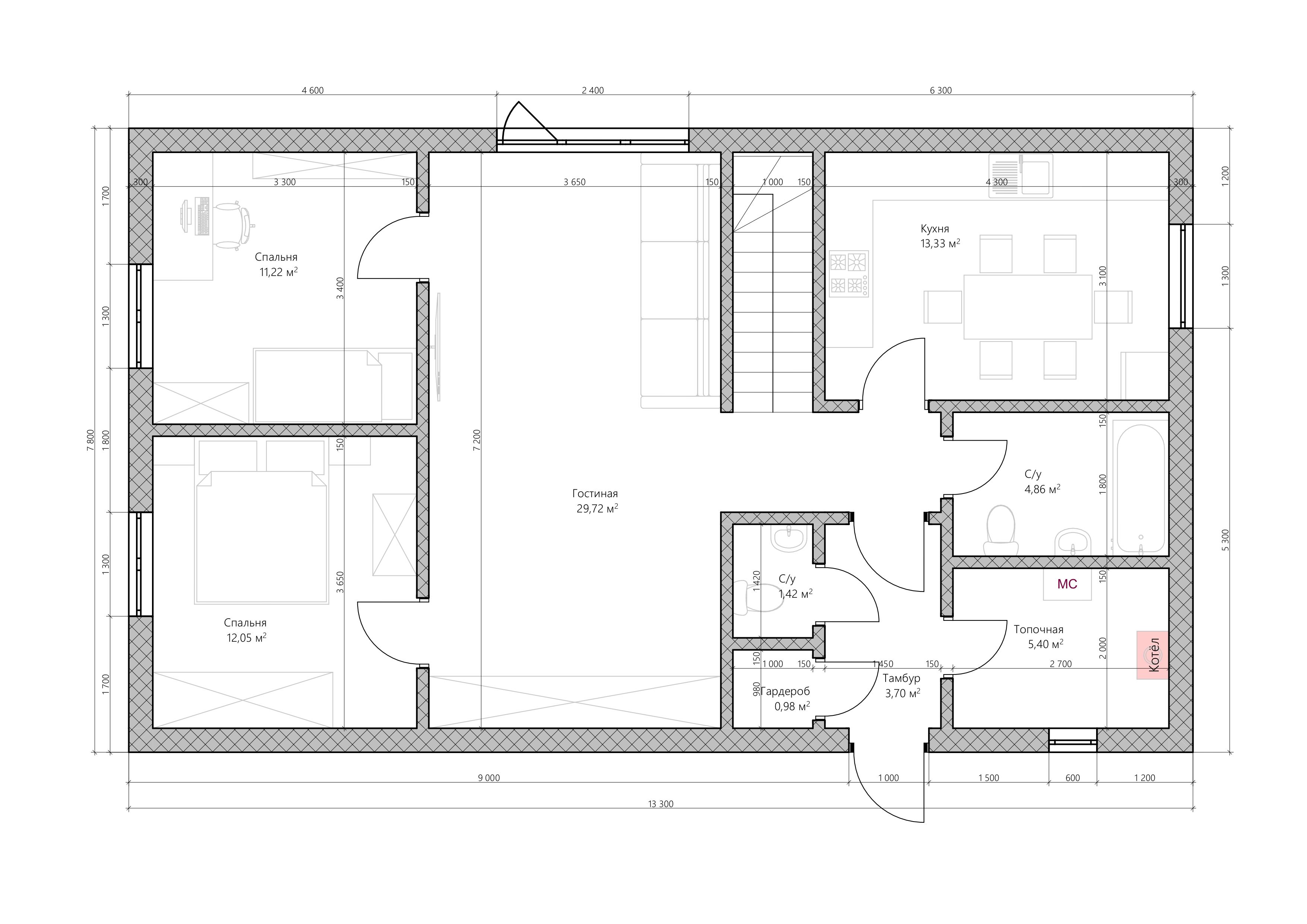 С армированиемВ зависимости от параметров участка и пожеланий Заказчика возможна адаптация проекта под технические условия, внесение линейных изменений, перепланировка, пристройка веранды, террасы, навеса, гаража и других объектов.