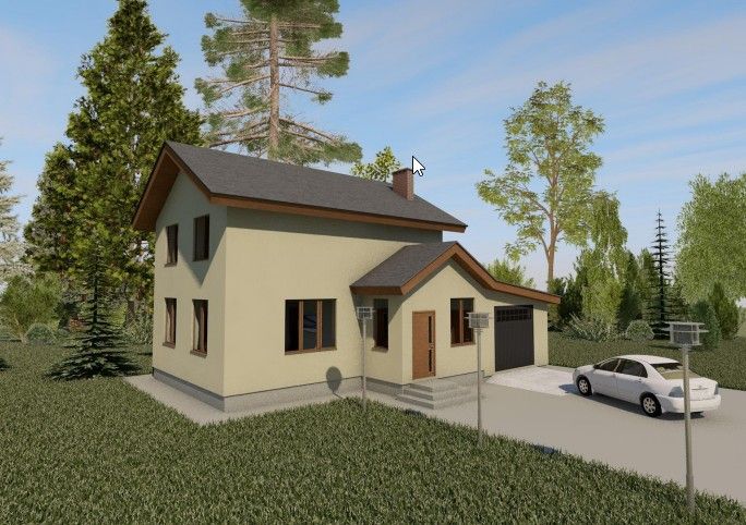 Готовый проект двухэтажного дома общей площадью 132,18 м². Стены дома могут быть выполнены из газосиликатных блоков или силикатного кирпича. По плану в доме две спальни (13,37 м², 12,53 м²), просторная кухня-гостиная (24,38 м²) и гараж.