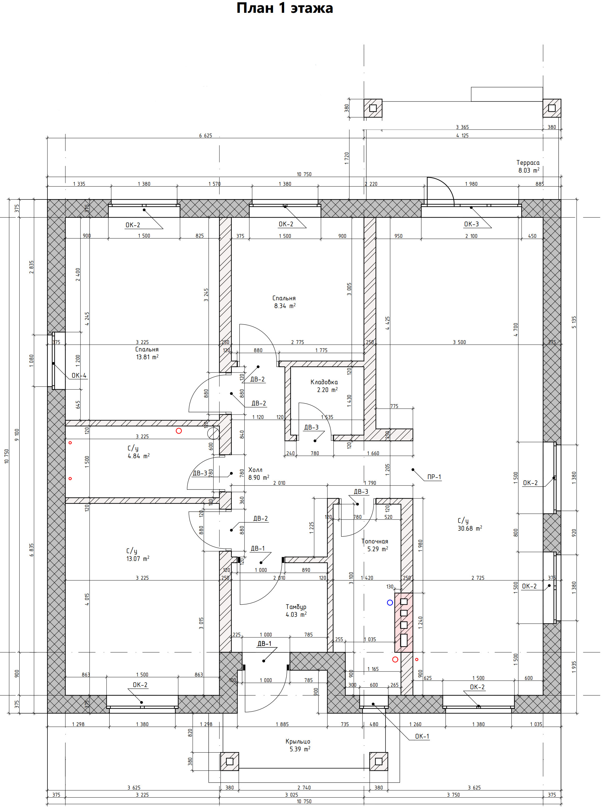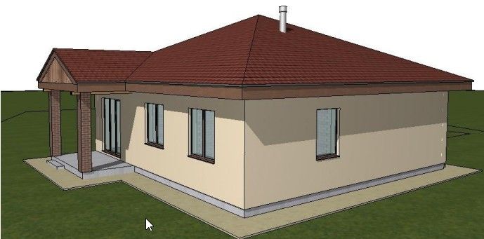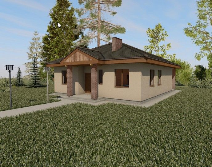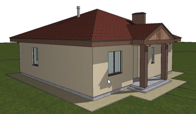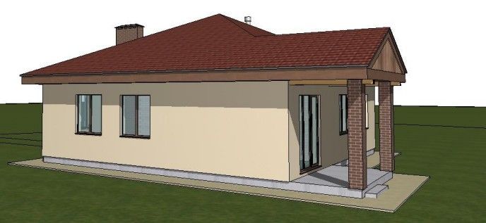 Готовый проект одноэтажного дома общей площадью 91,16 м². Стены дома могут быть выполнены из газосиликатных блоков или силикатного кирпича. По плану в доме две спальни, просторная кухня и гостиная.
