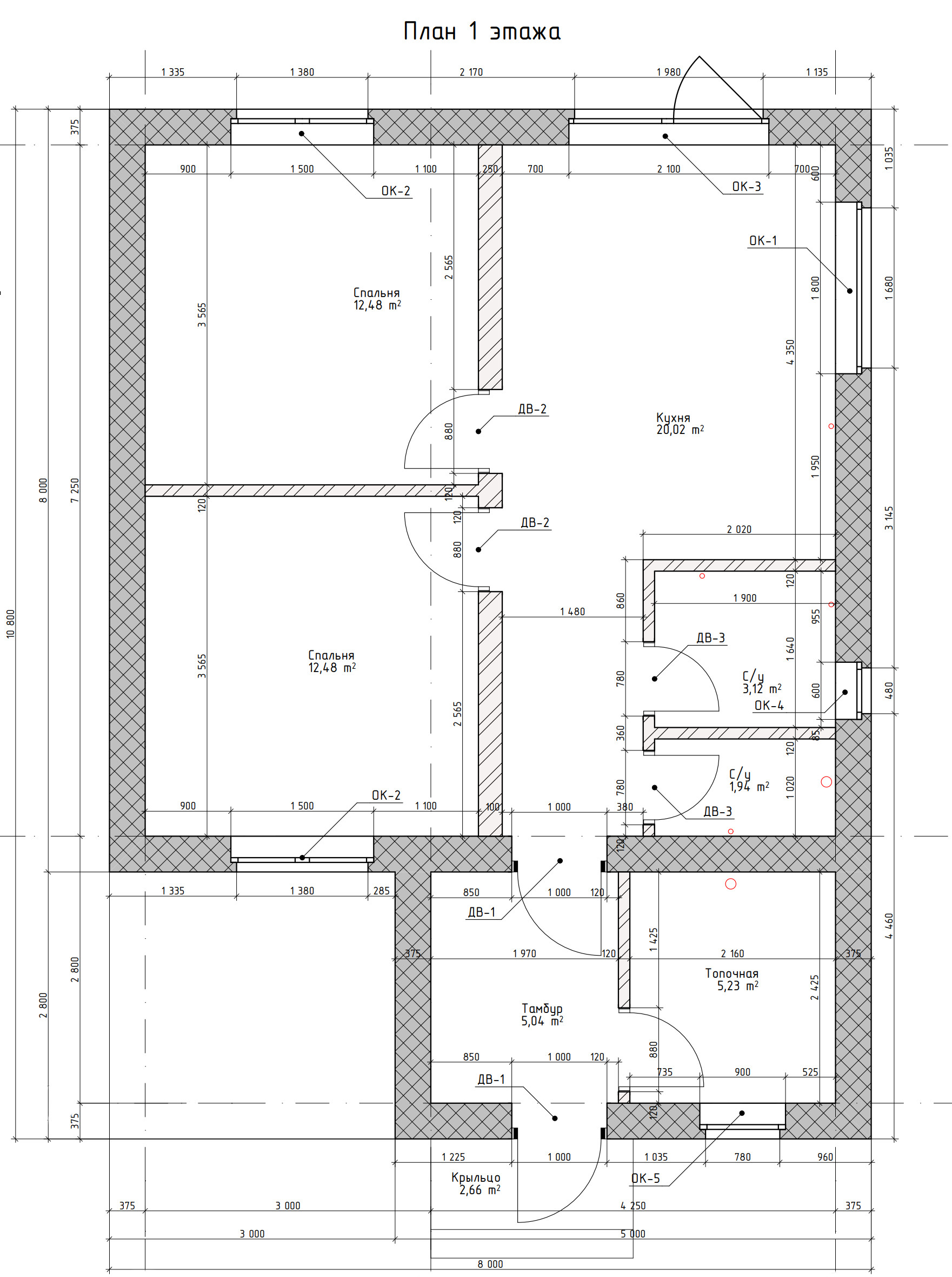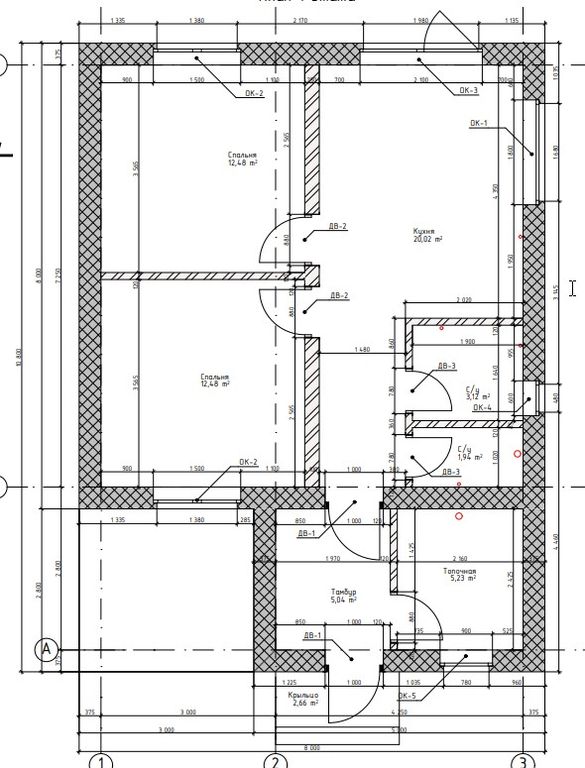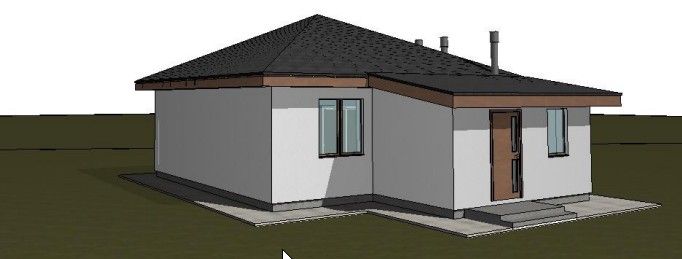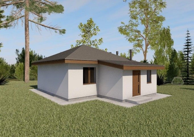 Готовый проект одноэтажного дома общей площадью 60,31 м². Стены дома могут быть выполнены из газосиликатных блоков или силикатного кирпича. По плану в доме две спальни (12,48 м², 12,48 м²), просторная кухня (20,02 м²).