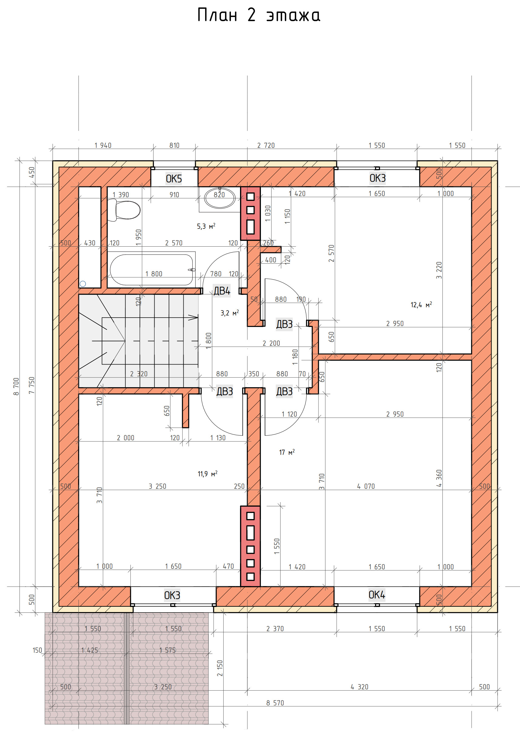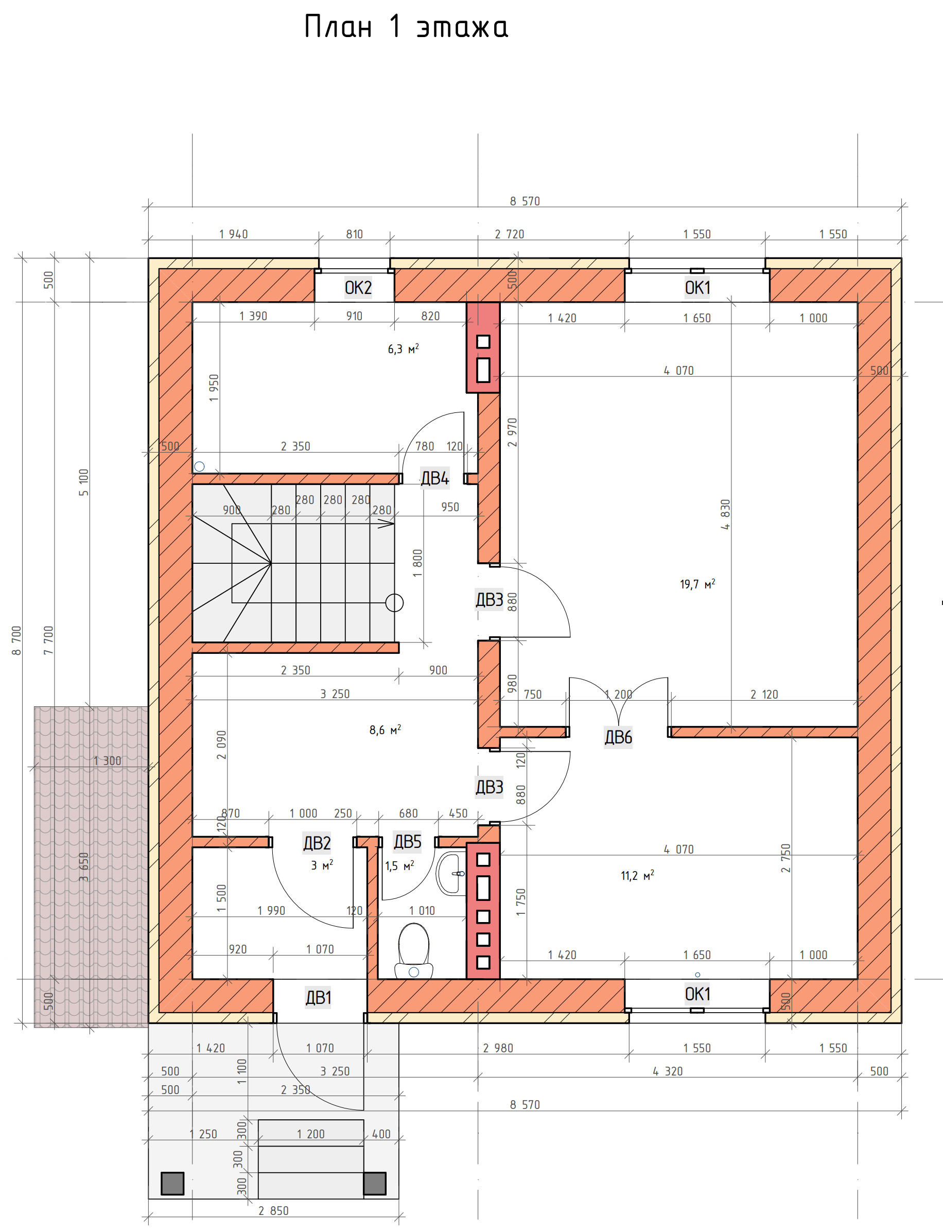 - Площадь кровли 1-го этажа: 8,2 м²