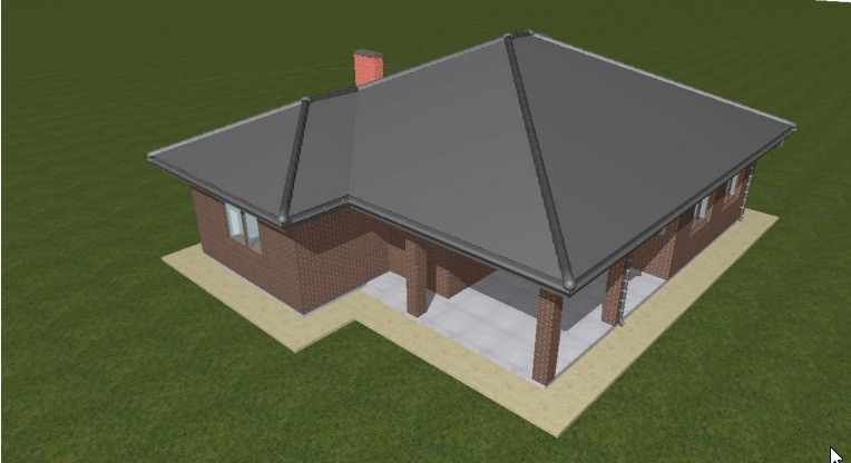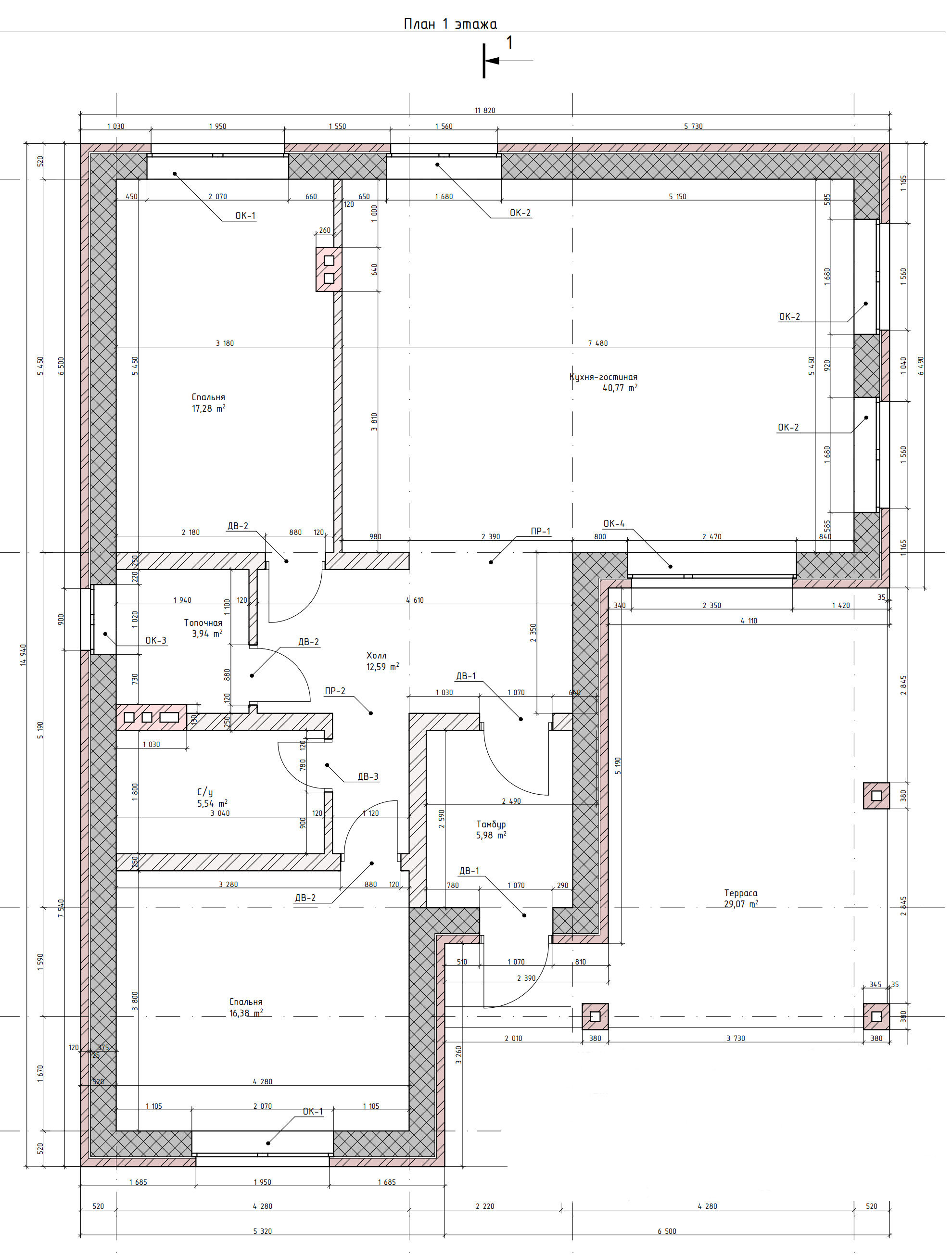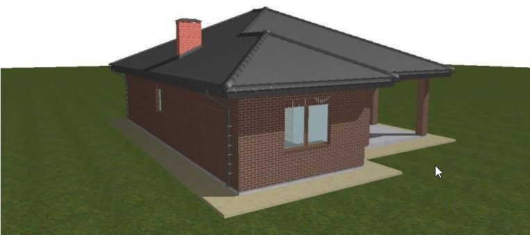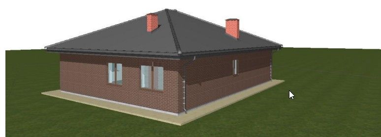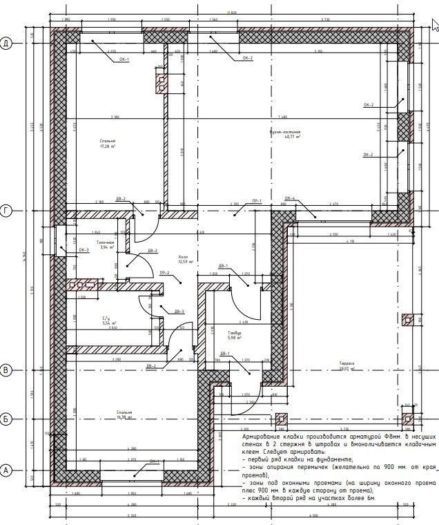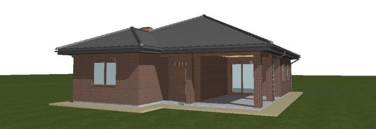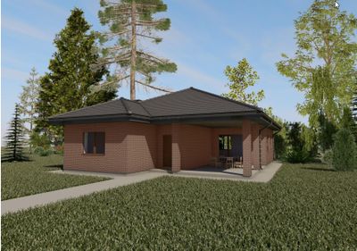 Готовый проект одноэтажного дома общей площадью 102,48 м². Стены дома могут быть выполнены из газосиликатных блоков или силикатного кирпича. По плану в доме две спальни (17,28 м², 16,38 м²), просторная объединенная кухня-гостиная (40,77 м²) и терраса (29,07 м²).