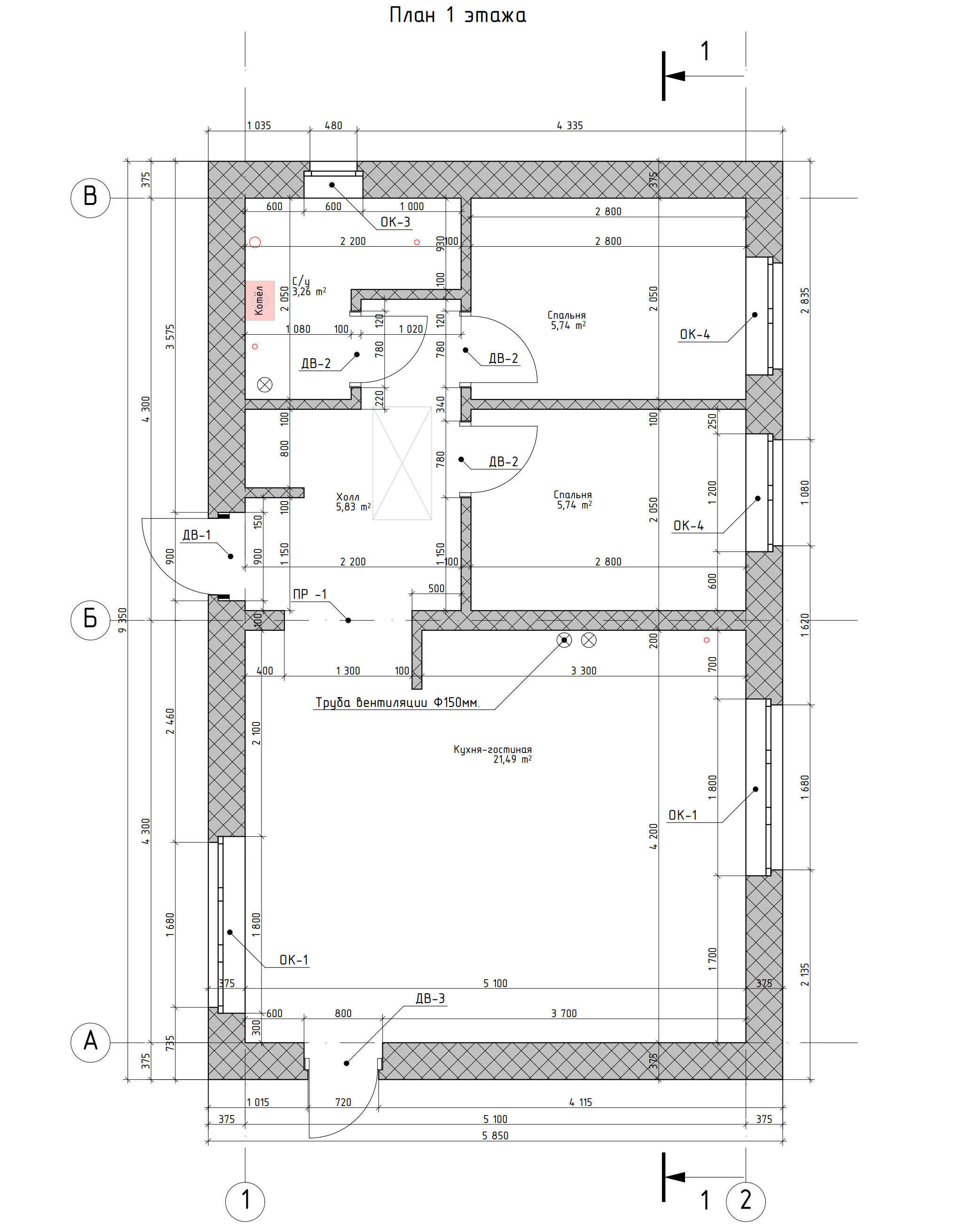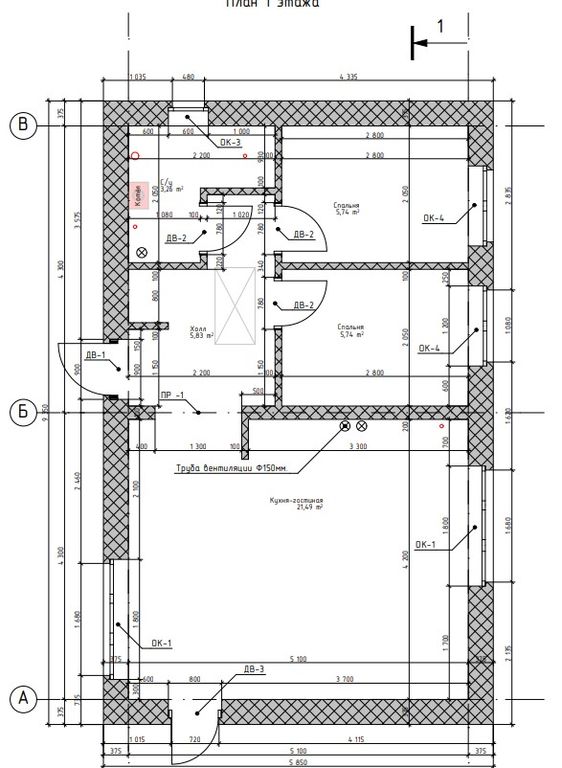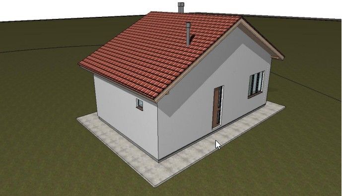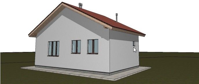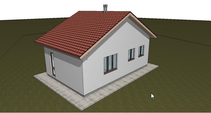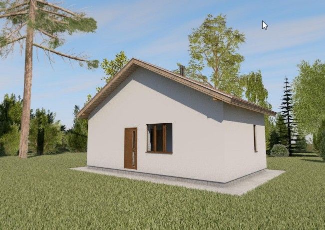 Готовый проект одноэтажного дома общей площадью 42,06 м². Стены дома могут быть выполнены из газосиликатных блоков или силикатного кирпича. По плану в доме две спальни (5,74 м², 5,74 м²), просторная кухня-гостиная (21,49 м²).