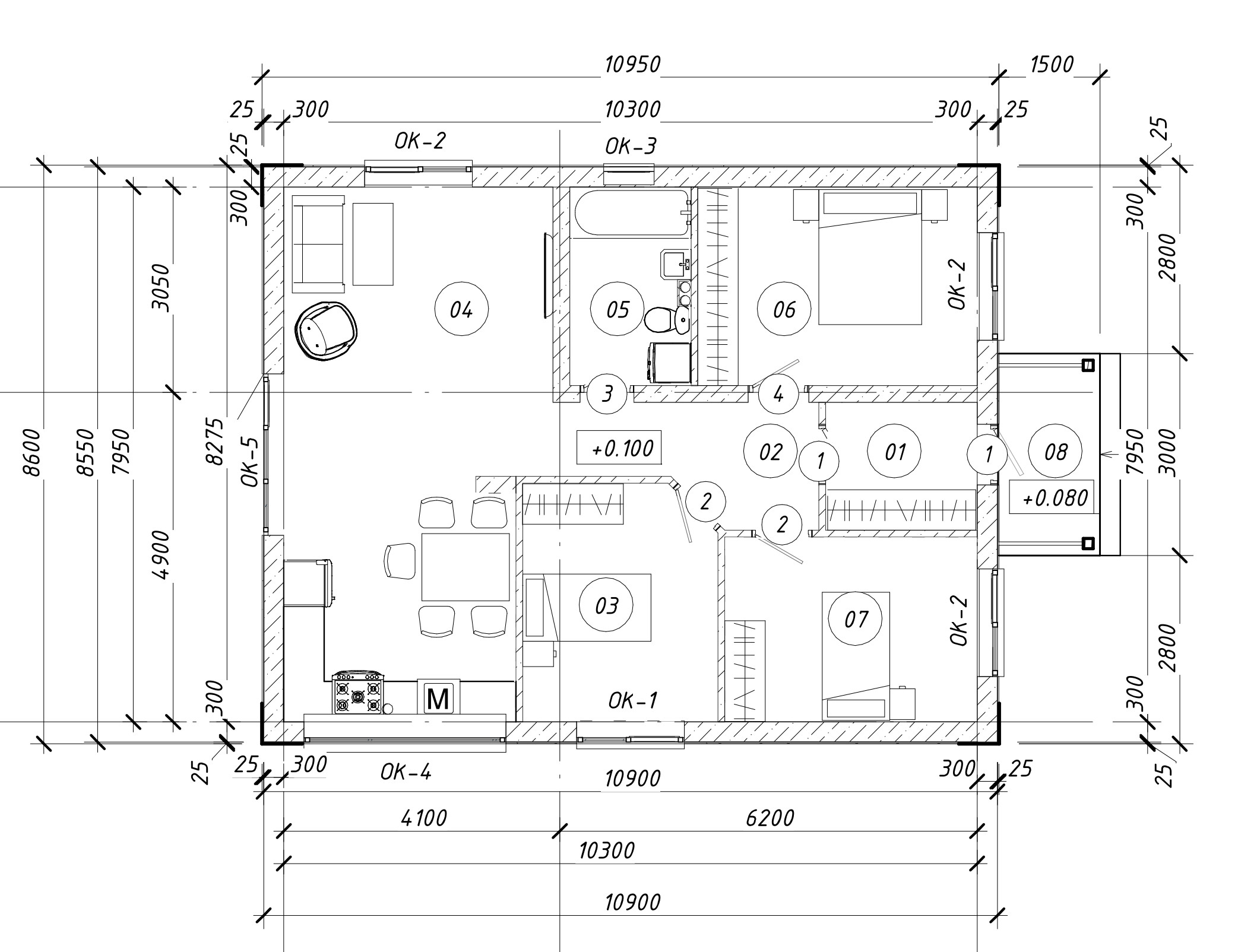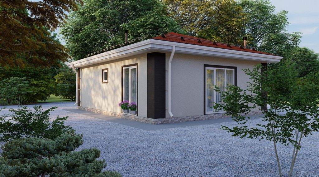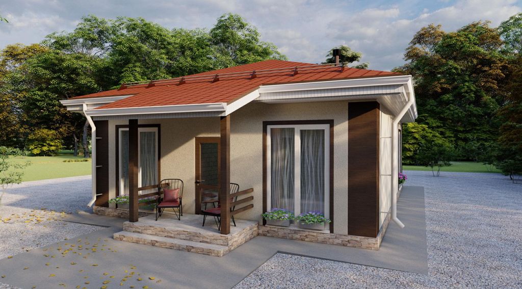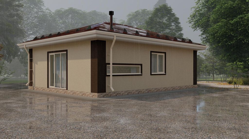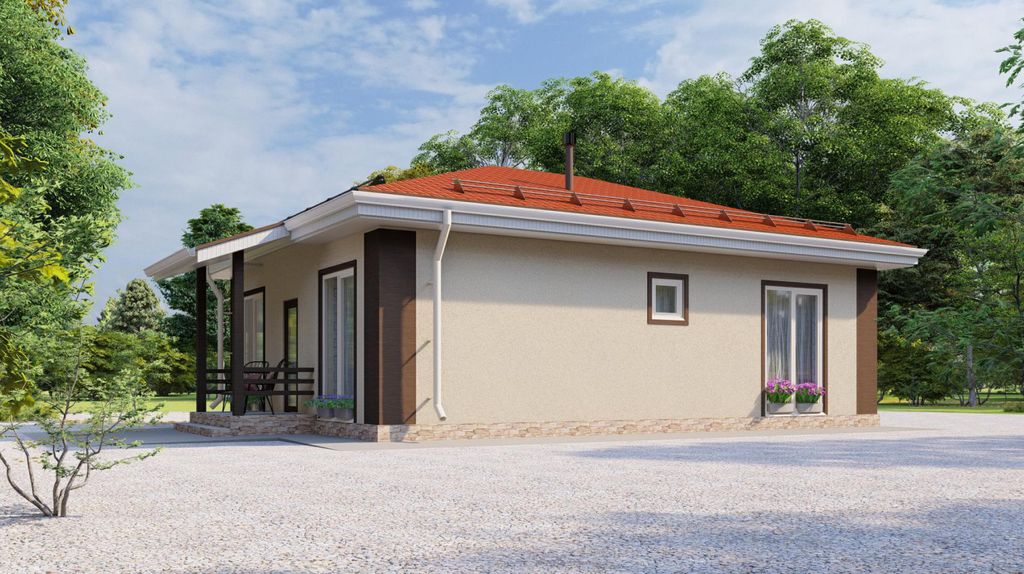 Готовый проект одноэтажного дома общей площадью 83 м². Стены дома могут быть выполнены из газосиликатных блоков или силикатного кирпича. По плану в доме тамбур (4,3 м²), холл (5,8 м²), кухня-столовая (29,4 м²), 3 комнаты (9,9 м², 10,3 м², 12,2 м²), санузел (5,2 м²).