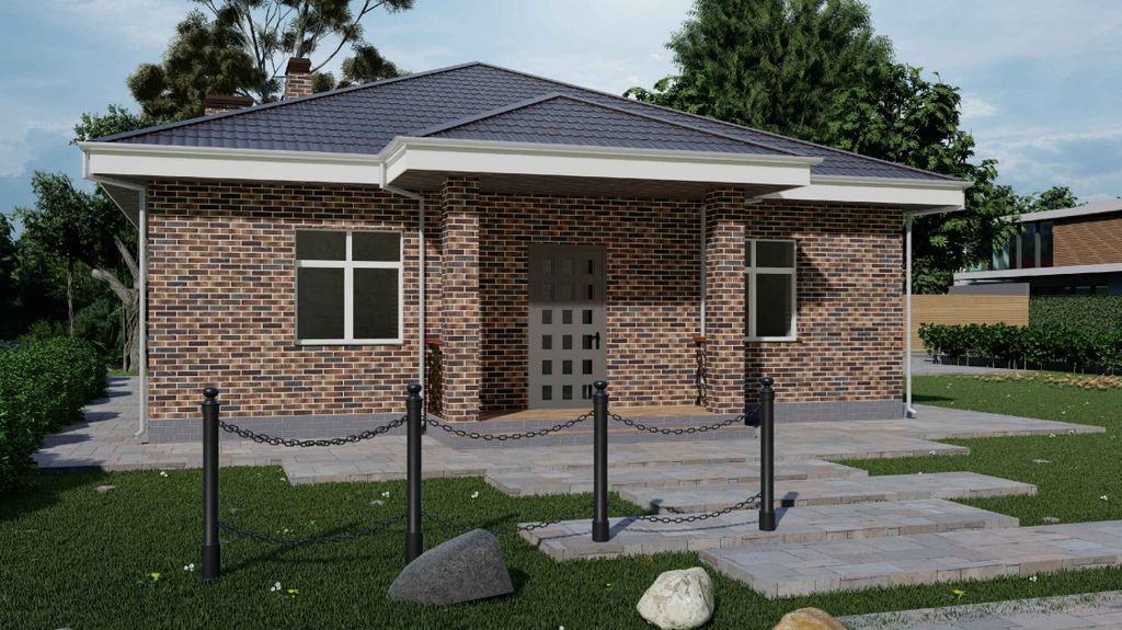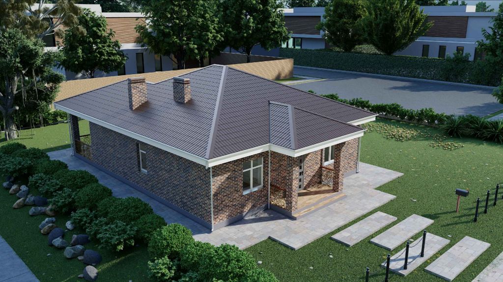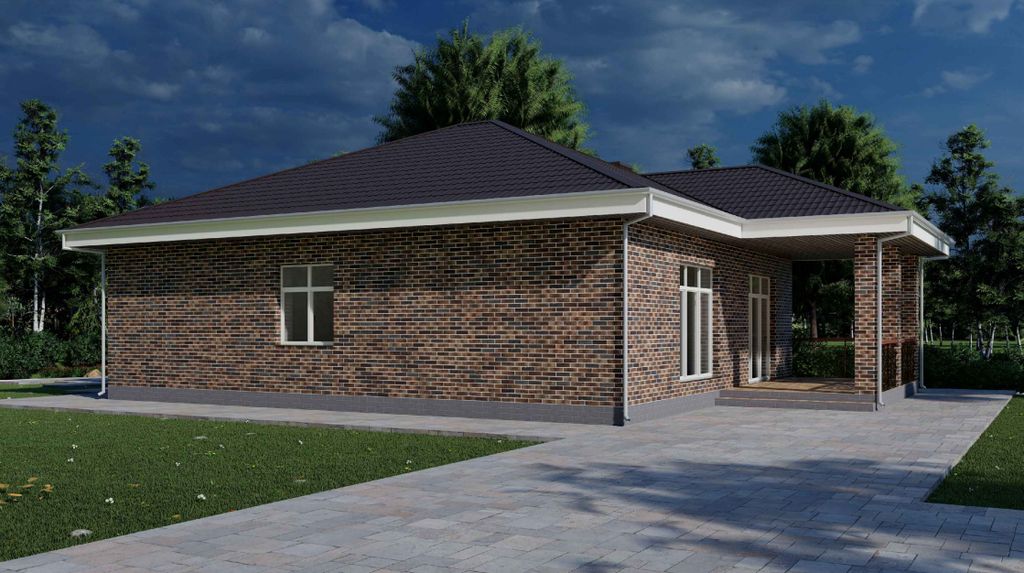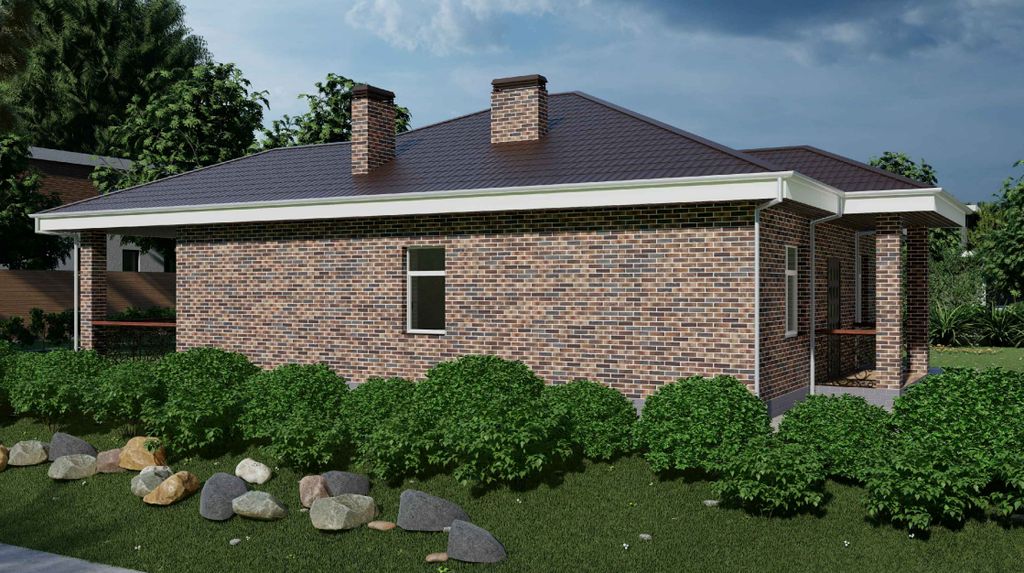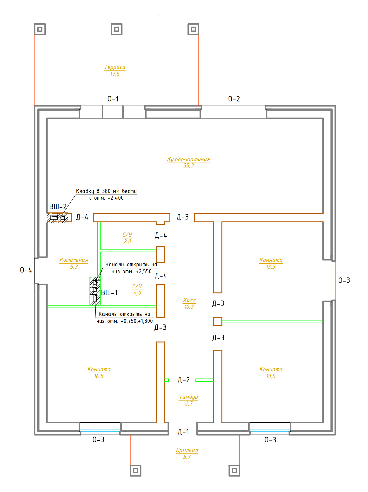 Готовый проект одноэтажного дома общей площадью 126,4 м². Стены дома могут быть выполнены из газосиликатных блоков или силикатного кирпича. По плану в доме тамбур (2,7 м²), холл (10,3 м²), котельная (5,3 м²), просторная кухня-гостиная (35,3 м²), 2 санузла (2,0 м², 4,0 м²), 3 комнаты (13,3 м², 13,5 м², 16,8 м²), терраса (17,5 м²).