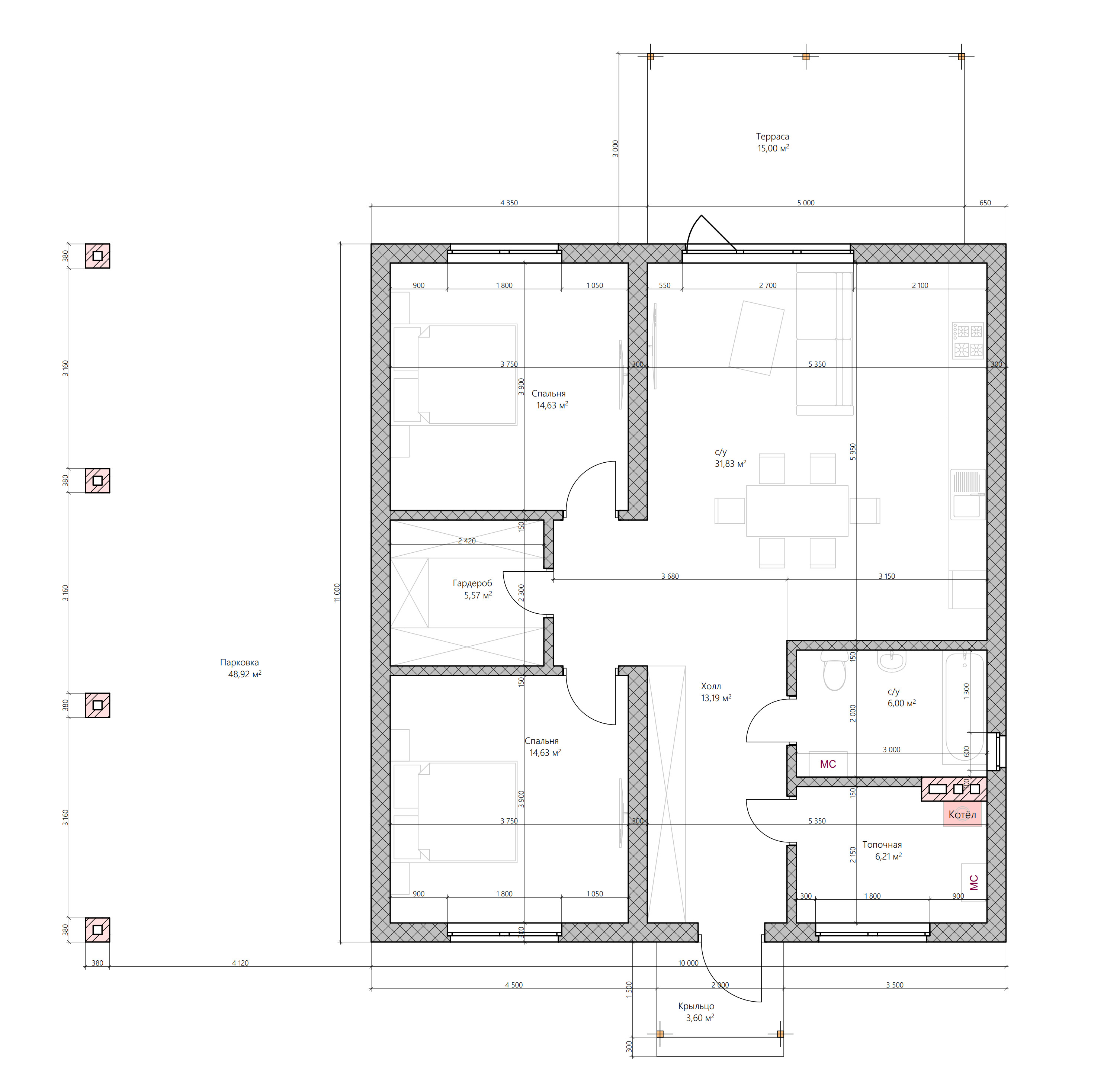 Готовый проект одноэтажного дома жилой площадью 92.06 м². Стены дома могут быть выполнены из газосиликатных блоков или силикатного кирпича. По плану в доме две спальни (14.63 м² и 14.63 м²), гардероб (5.57 м²), кухня/гостиная (31.83 м²), санузел (6.00 м²), холл (13.19 м²), топочная (6.21 м²), крыльцо (3.60 м²), терраса (15.00 м²) и парковка (48.92 м²).
