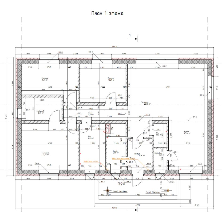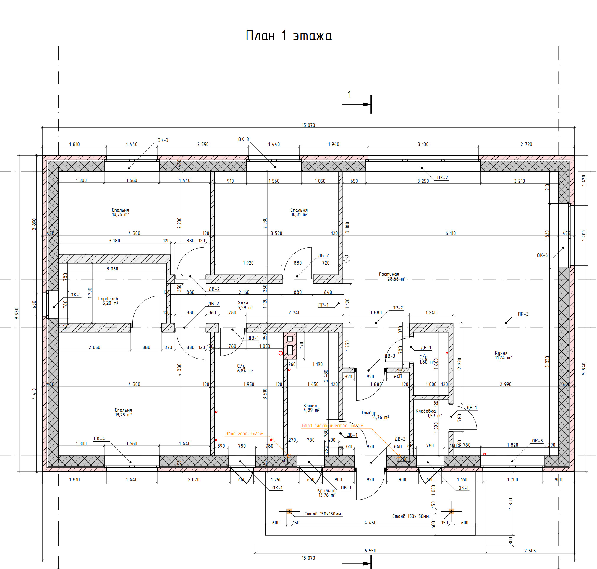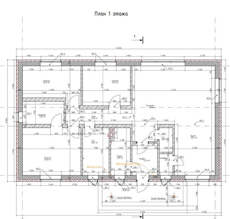 - Высота 1-го этажа: 3 м