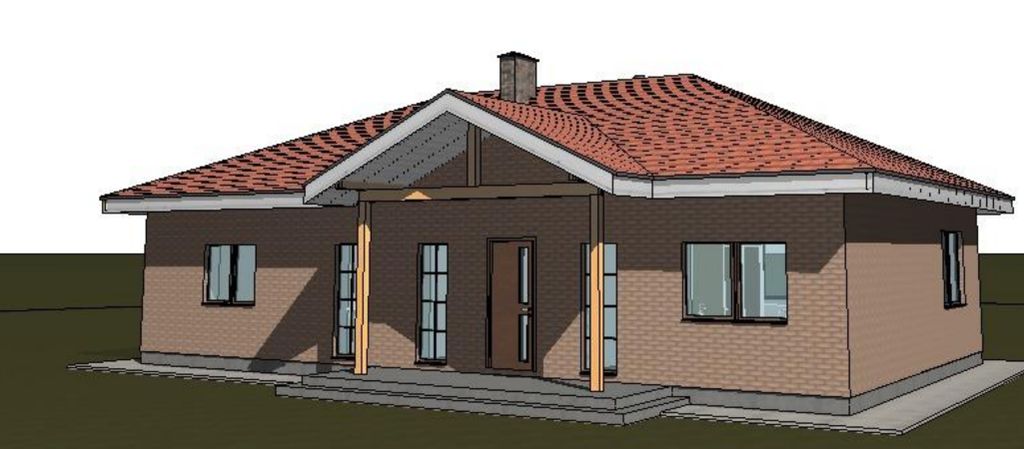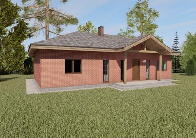 Готовый проект одноэтажного дома общей площадью 104,88 м². Стены дома могут быть выполнены из газосиликатных блоков или силикатного кирпича. По плану в доме тамбур (4,76 м²), котельная (4,89 м²), кладовая (1,59 м²), кухня (11,24 м²), гостиная (28,66 м²), санузел (6,84 м²), гардероб (5,20 м²), 3 спальни (10,31 м², 10,75 м², 13,25 м²).