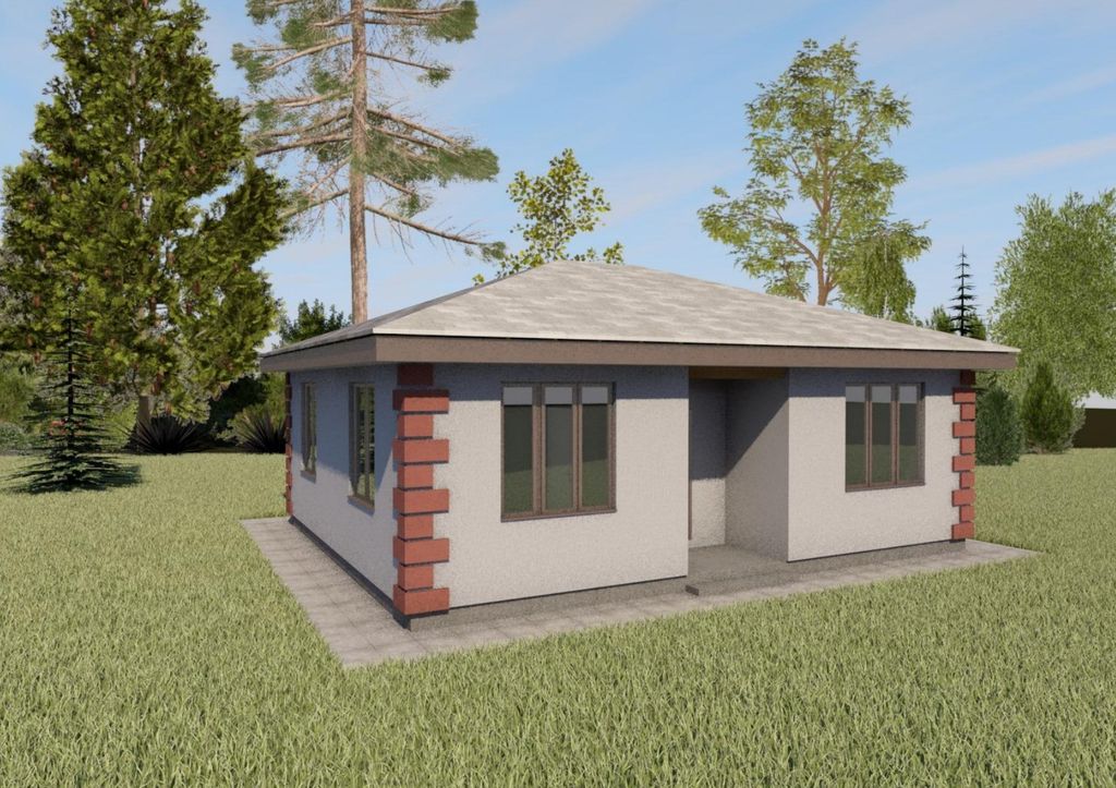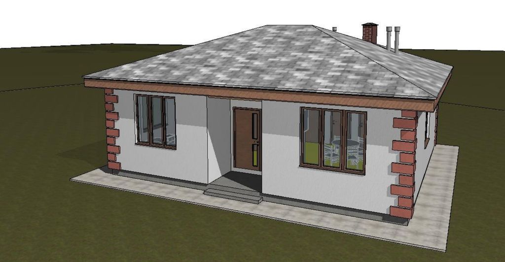 Готовый проект одноэтажного дома общей площадью 68,92 м². Стены дома могут быть выполнены из газосиликатных блоков или силикатного кирпича. По плану в доме холл (8,20 м²), топочная (5,35 м²), кухня-столовая (21,45 м²), 2 санузла (4,40 м², 2,28 м²), 2 спальни (13,62 м², 13,62 м²).
