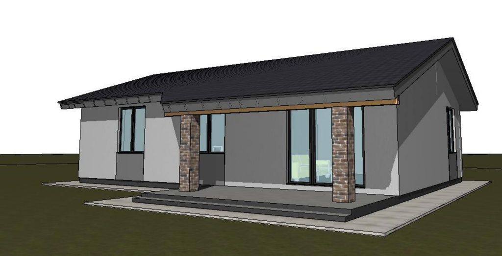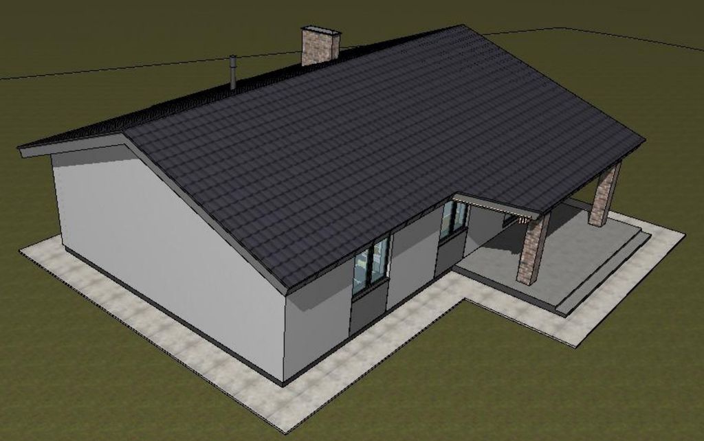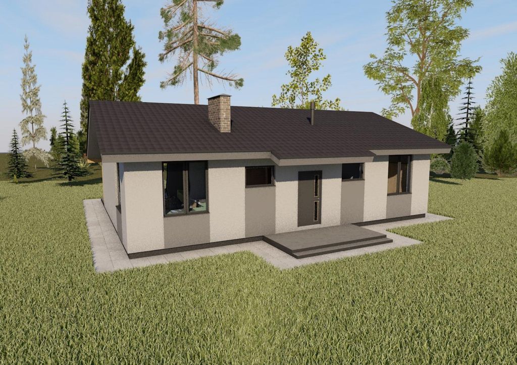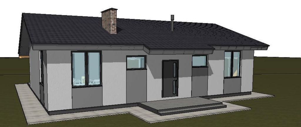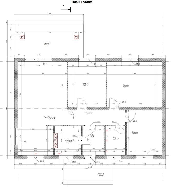 Готовый проект одноэтажного дома общей площадью 98,66 м². Стены дома могут быть выполнены из газосиликатных блоков или силикатного кирпича. По плану в доме холл (7,00 м²), топочная (5,63 м²), просторная кухня-гостиная (32,02 м²), санузел (4,46 м²), 3 спальни (12,32 м², 13,12 м², 19,08 м²) и терраса (19,50 м²).