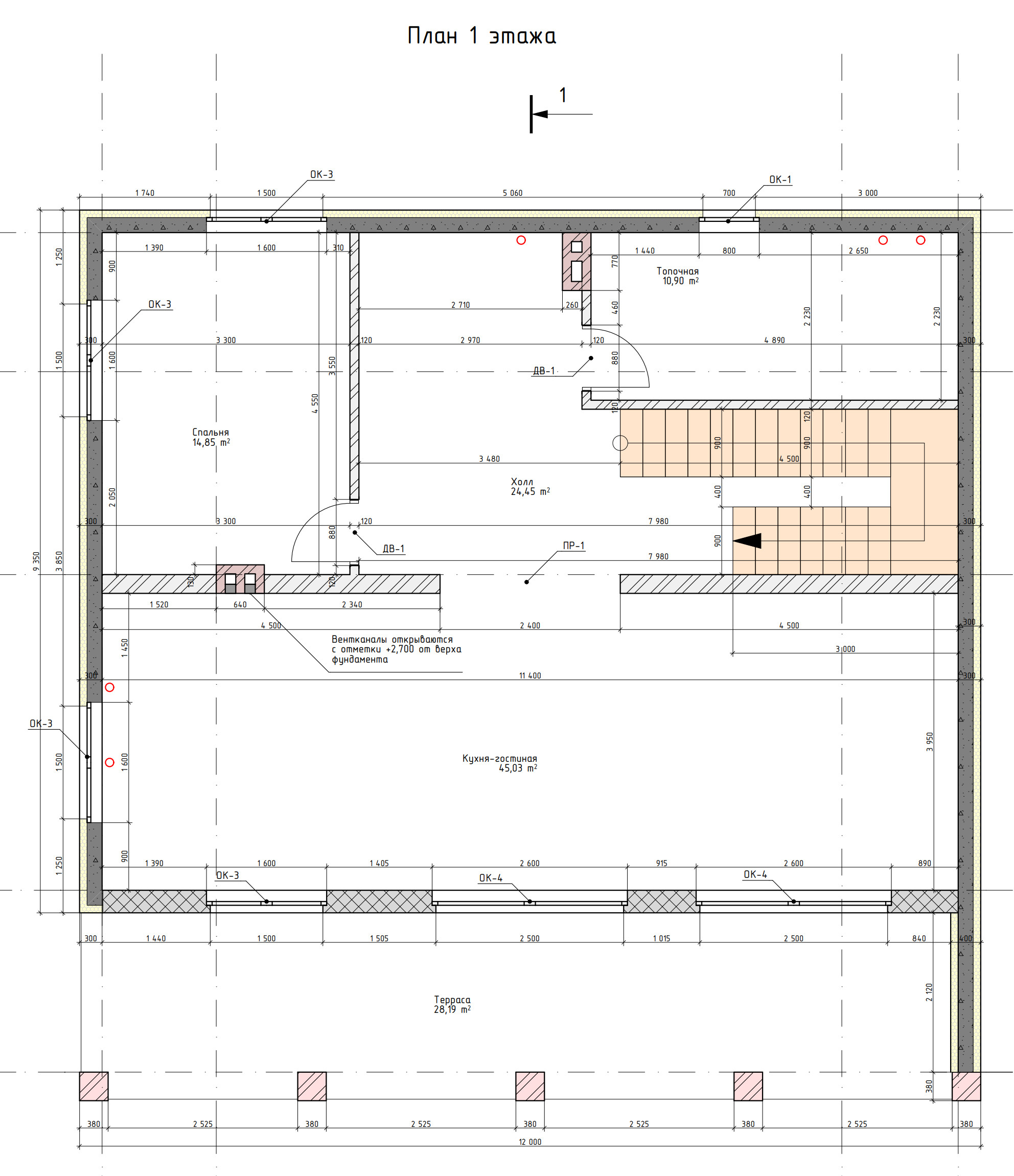 - Высота 1-го этажа: 3 м