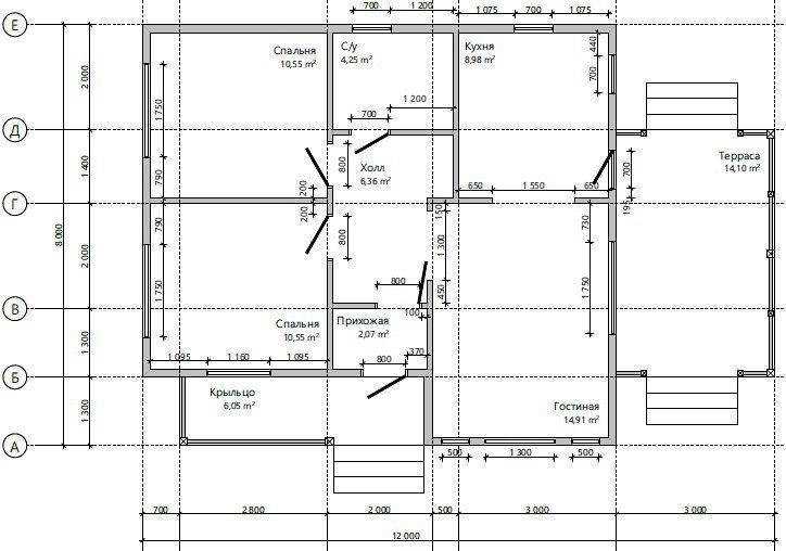Готовый проект одноэтажного дома общей площадью 85 м² для строительства по каркасной технологии. По плану в доме прихожая (2,07 м²), холл (6,36 м²), санузел (4,25 м²), кухня (8,98 м²), гостиная (14,91 м²), две спальни (10,55 м², 10,55 м²) и терраса (14,10 м²).