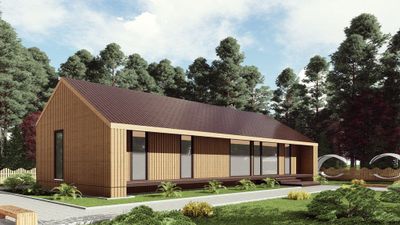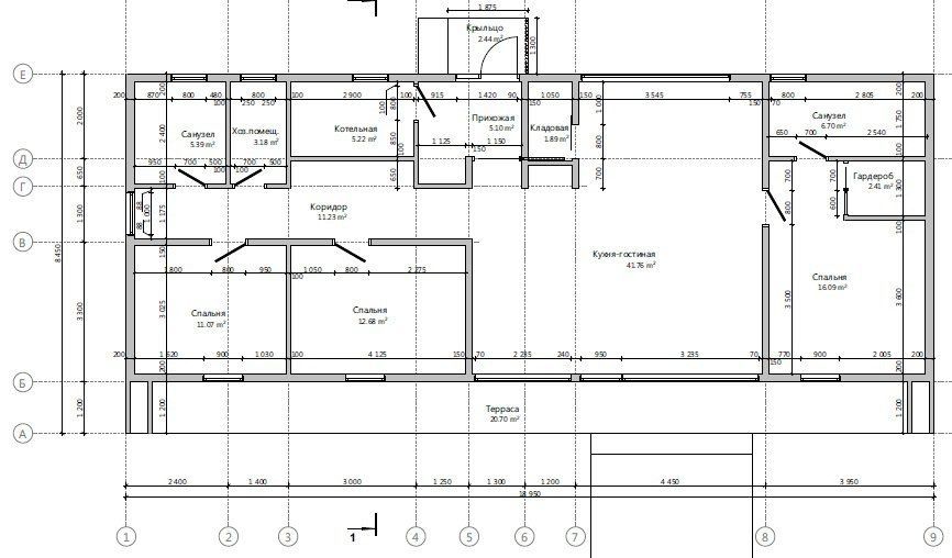 Готовый проект одноэтажного дома общей площадью 153 м² для строительства по каркасной технологии. По плану в доме прихожая (5,10 м²), коридор (11,23 м²), хоз. помещение (3,18 м²), котельная (5,22 м²), кладовая (1,89 м²), 2 санузла (5,39 м², 6,70 м²), кухня-гостиная (41,76 м²), 3 спальни (11,07 м², 12,68 м², 16,09 м²), гардероб (2,41 м²), терраса (20,70 м²).