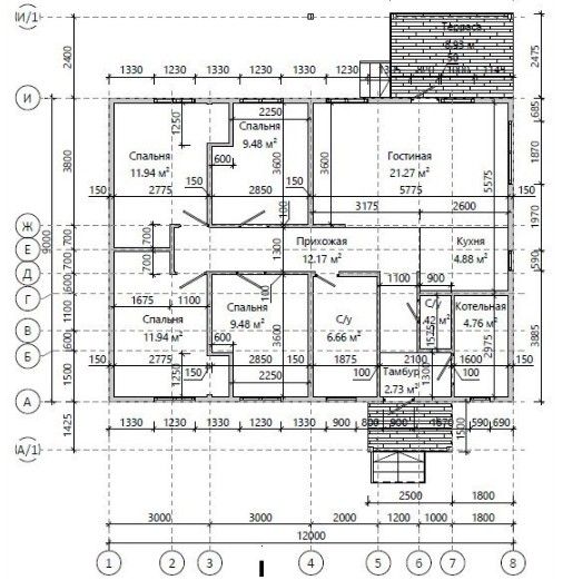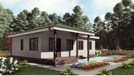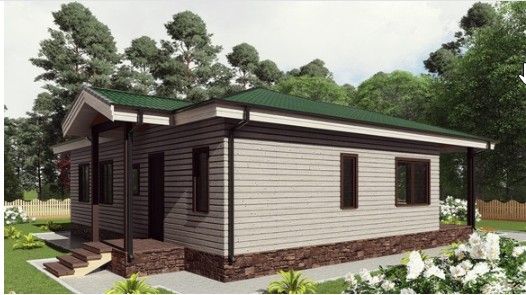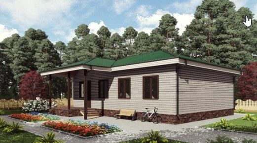 Готовый проект одноэтажного дома общей площадью 98 м² для строительства по каркасной технологии. По плану в доме тамбур, котельная, прихожая, два санузла, кухня, гостиная и четыре спальни.