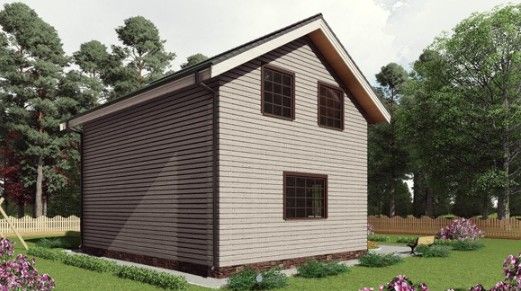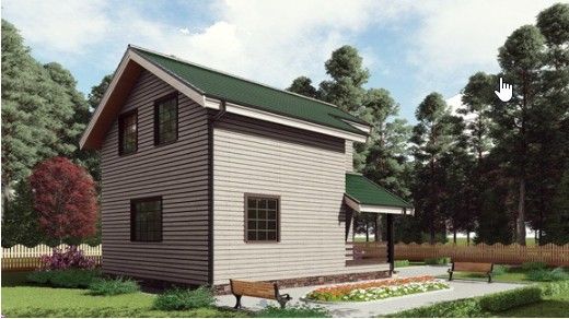 Готовый проект двухэтажного дома общей площадью 90 м² для строительства по каркасной технологии. По плану в доме прихожая, котельная, коридор, два санузла, просторная кухня-гостиная, три спальни.