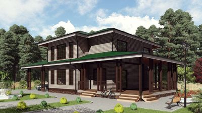 Готовый проект двухэтажного дома общей площадью 250 м² для строительства по каркасной технологии. По плану в доме холл, котельная, 2 санузла, кухня, зал, 4 спальни, терраса и навес.