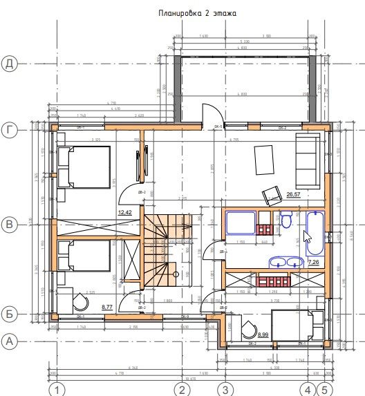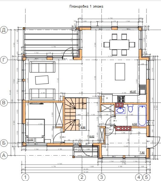 Готовый проект двухэтажного дома общей площадью 146,32 м² для строительства по каркасной технологии. По плану в доме холл, 2 санузла, просторная кухня-гостиная, 4 спальни, зал, терраса.