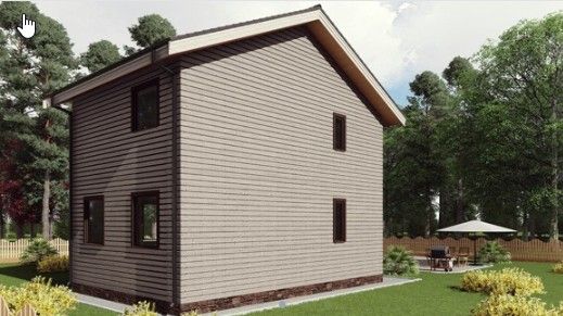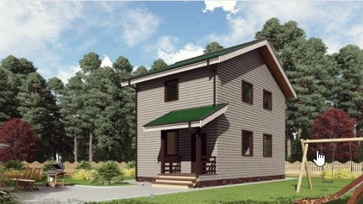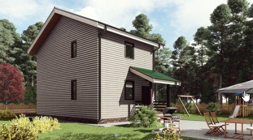 Готовый проект двухэтажного дома общей площадью 145 м² для строительства по каркасной технологии. По плану в доме прихожая, коридор, санузел, кухня, гостиная, две спальни.