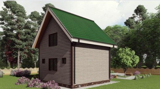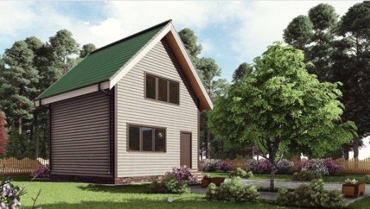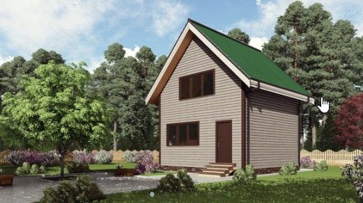 Готовый проект двухэтажного дома общей площадью 50 м² для строительства по каркасной технологии. По плану в доме тамбур, холл, санузел, моечная, парная, кухня-гостиная, две спальни.