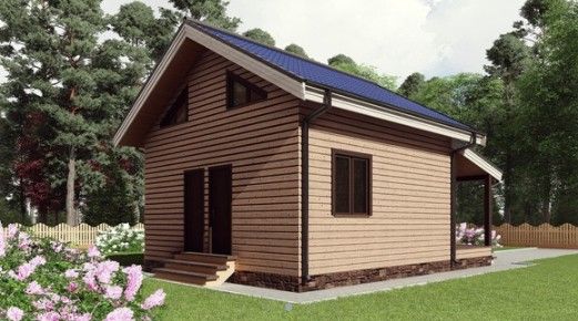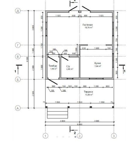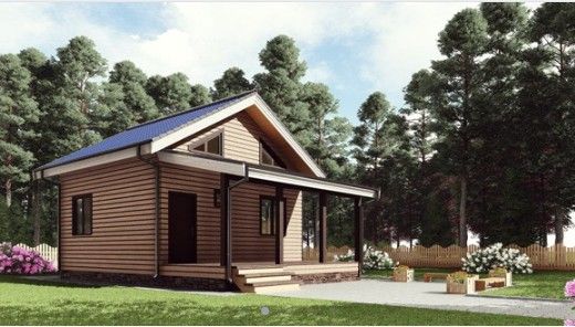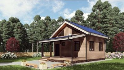 Готовый проект одноэтажного дома общей площадью 50 м² для строительства по каркасной технологии. По плану в доме тамбур, санузел, кухня, гостиная и терраса.