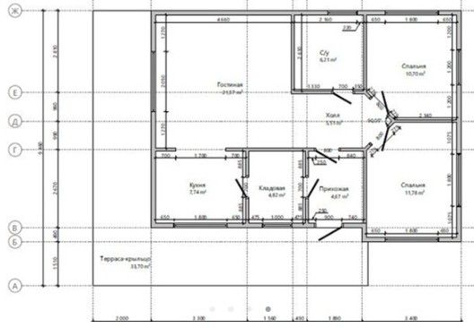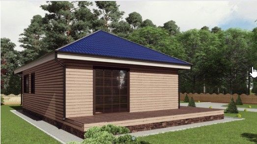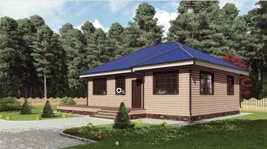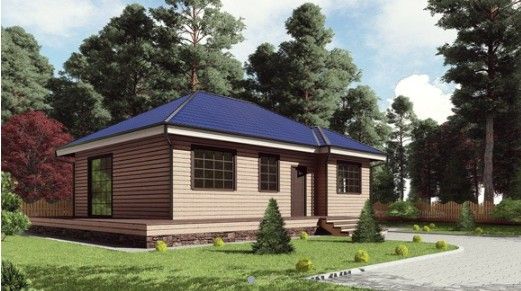 Готовый проект одноэтажного дома общей площадью 95 м² для строительства по каркасной технологии. По плану в доме прихожая, кладовая, холл, санузел, кухня, гостиная, две спальни и терраса.