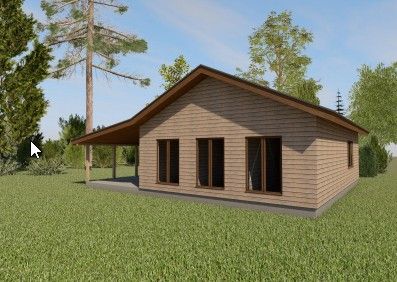 Готовый проект одноэтажного дома общей площадью 85,79 м² для строительства по каркасной технологии. По плану в доме тамбур (2,99 м²), холл (9,02 м²), два санузла (2,09 м², 6,66 м²), топочная (6,63 м²), кухня-гостиная (34,57 м²), три спальни (11,05 м², 11,72 м², 11,05 м²) и терраса (61,50 м²).