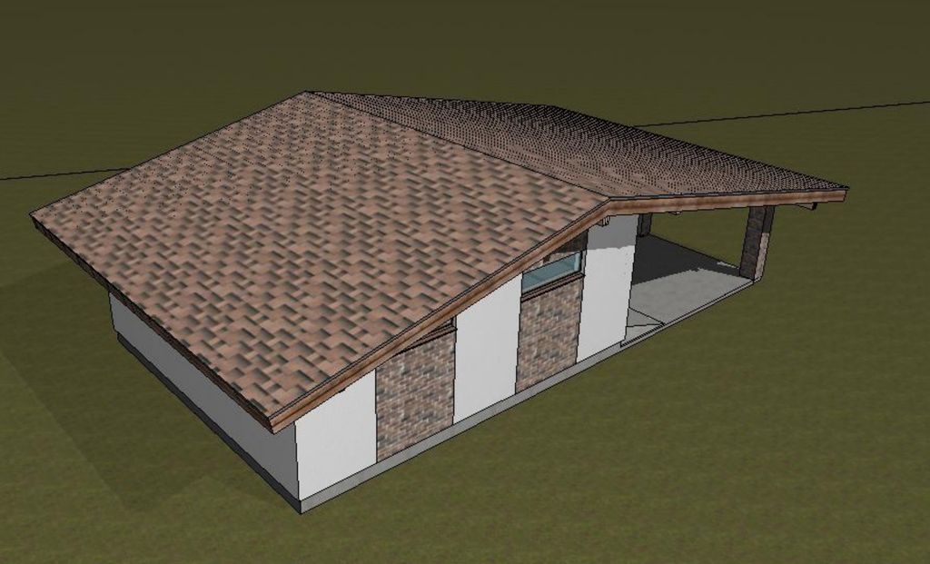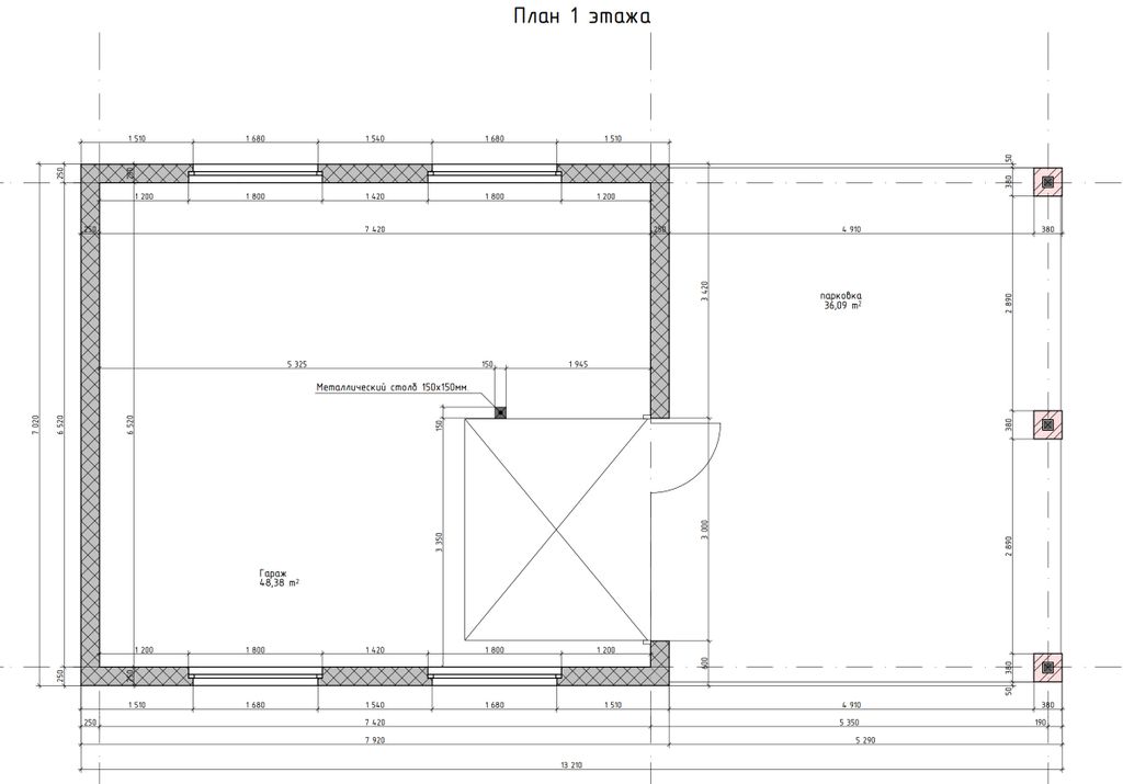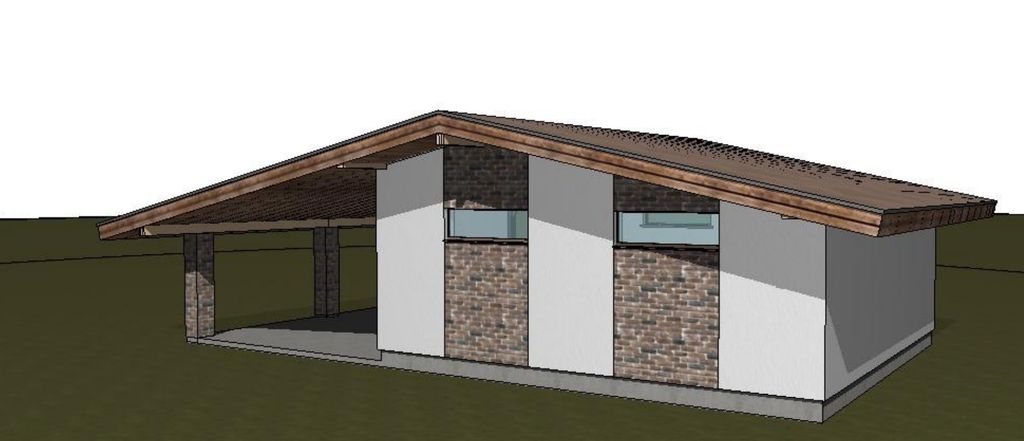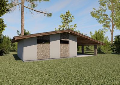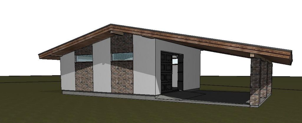 Готовый проект одноэтажного гаража с навесом общей площадью 48,38 м². Стены гаража могут быть выполнены из газосиликатных блоков или силикатного кирпича. По плану гараж (48,38 м²) и парковка под навесом (36,09 м²).