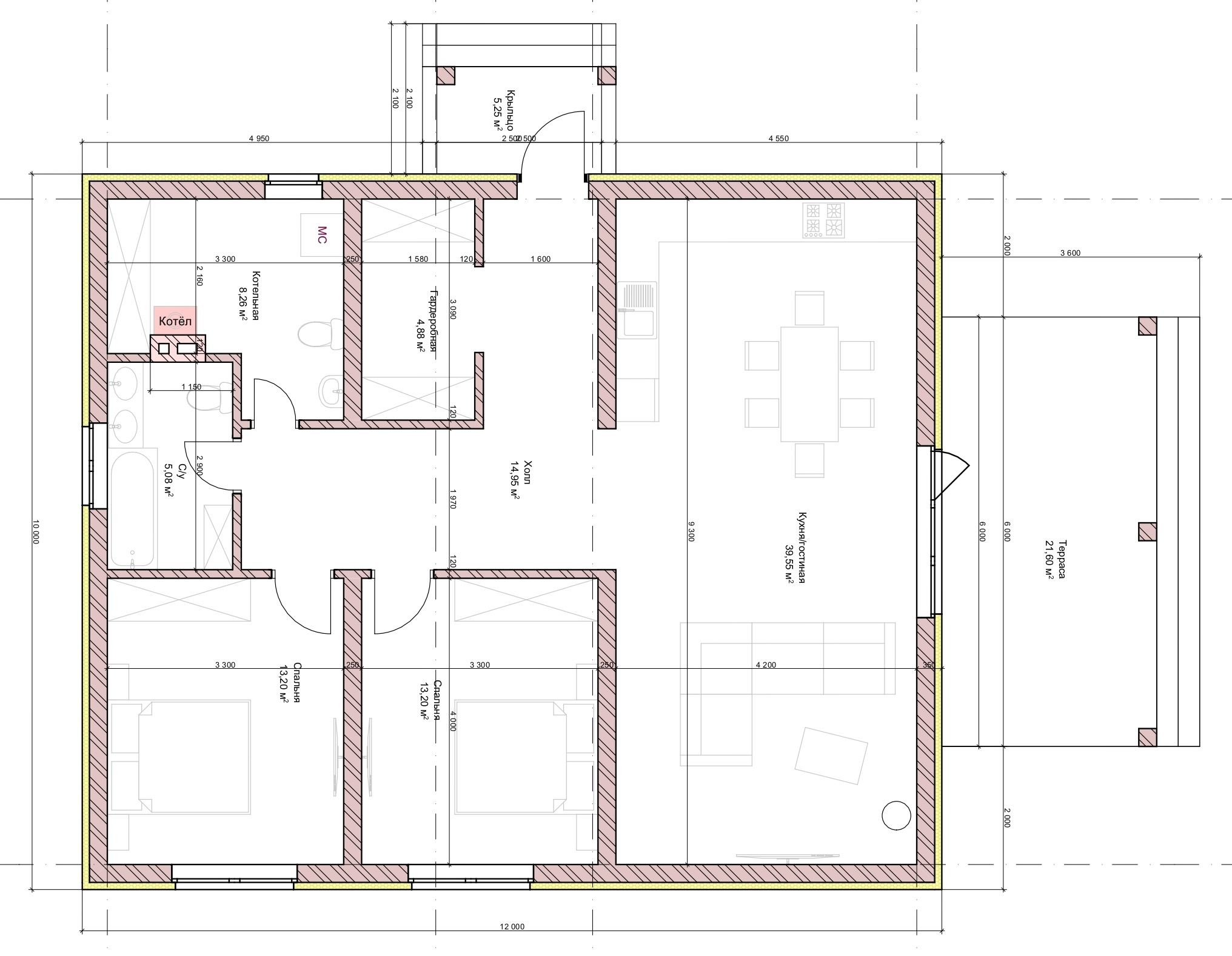 С армированиемВ зависимости от параметров участка и пожеланий Заказчика возможна адаптация проекта под технические условия, внесение линейных изменений, перепланировка, пристройка веранды, террасы, навеса, гаража и других объектов.