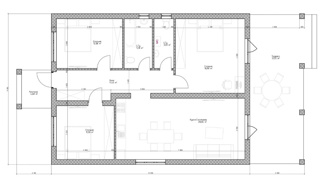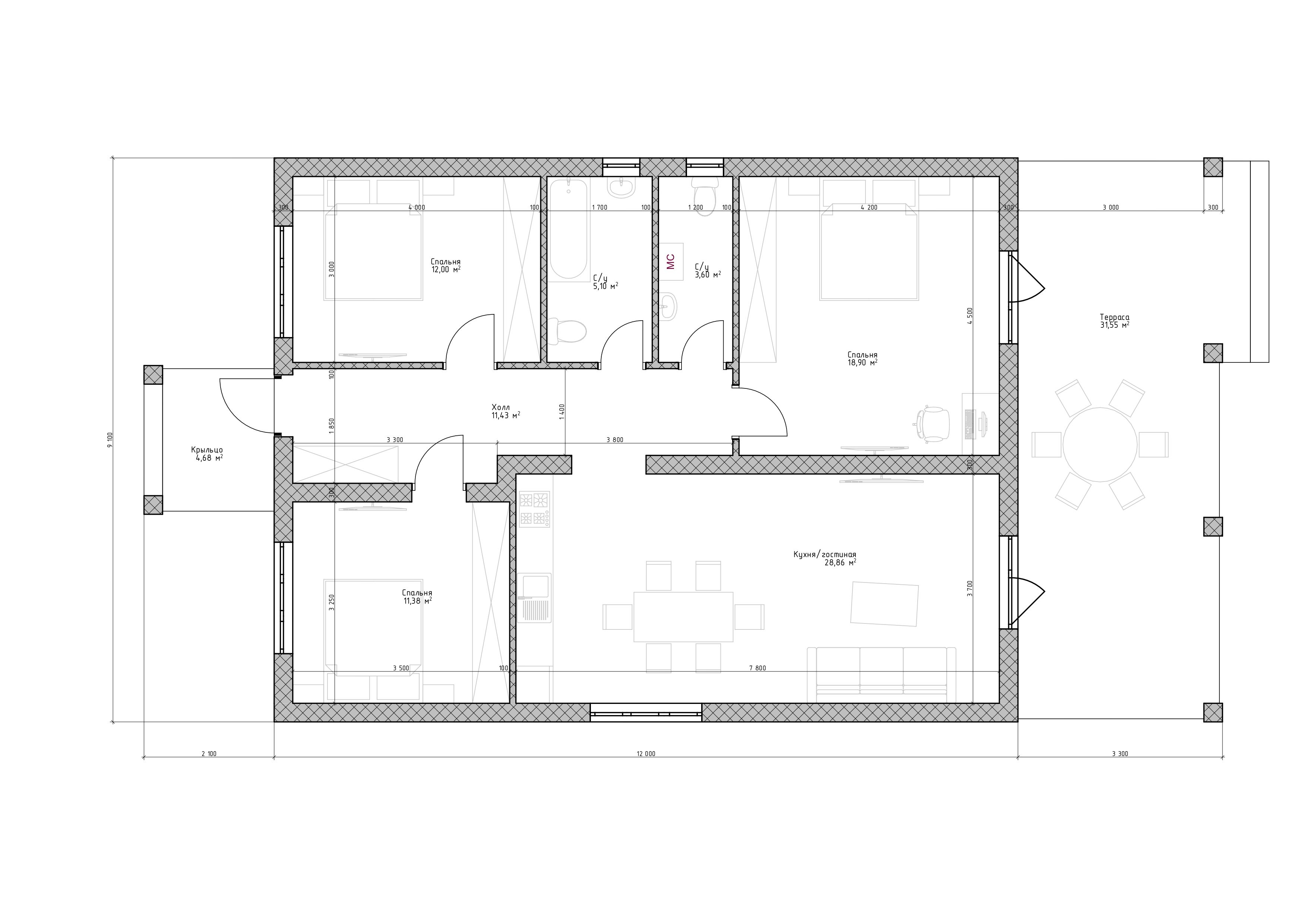 С армированиемВ зависимости от параметров участка и пожеланий Заказчика возможна адаптация проекта под технические условия, внесение линейных изменений, перепланировка, пристройка веранды, террасы, навеса, гаража и других объектов.